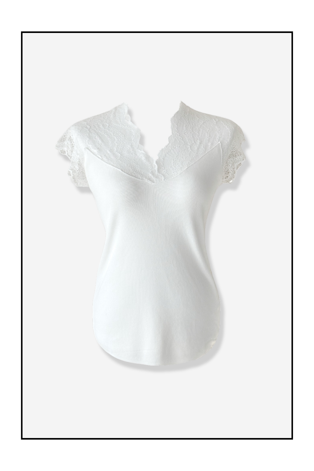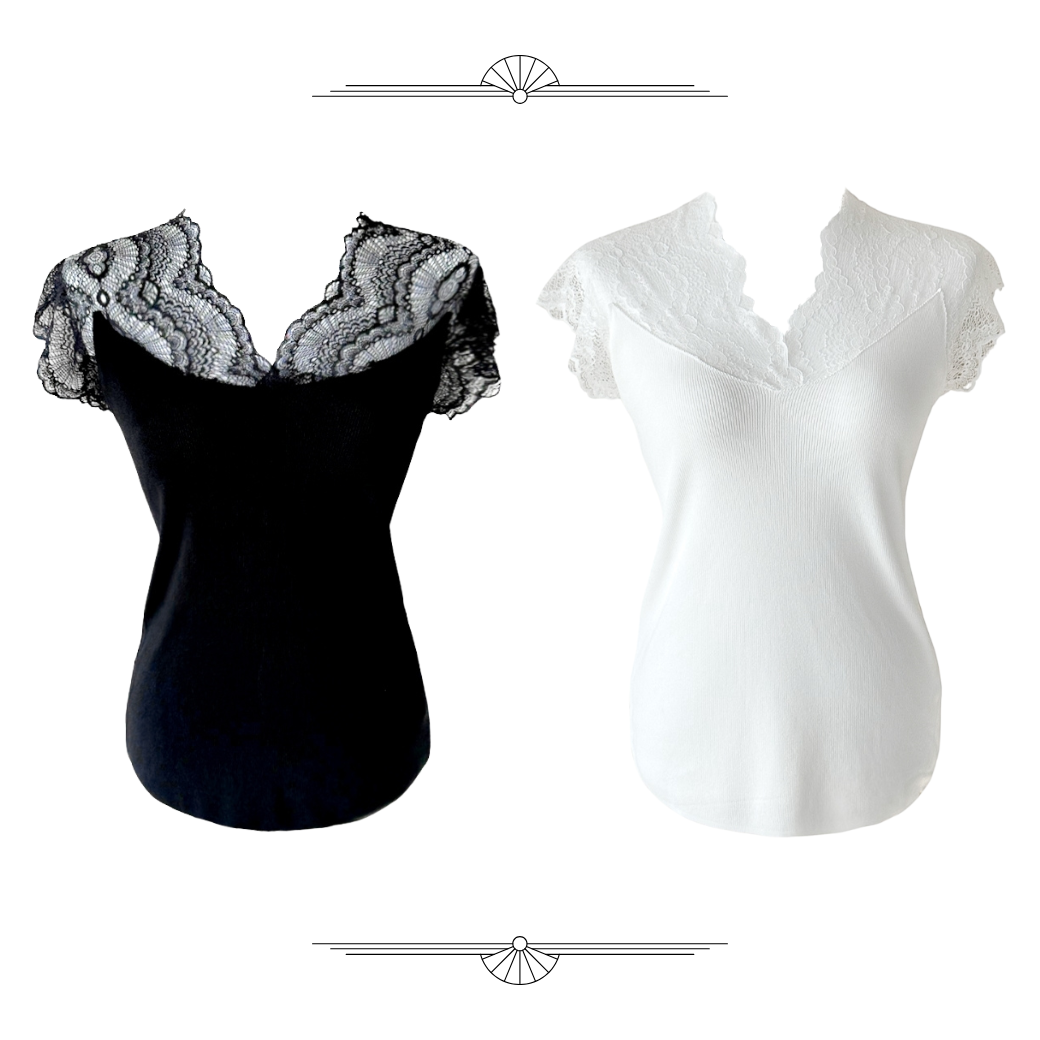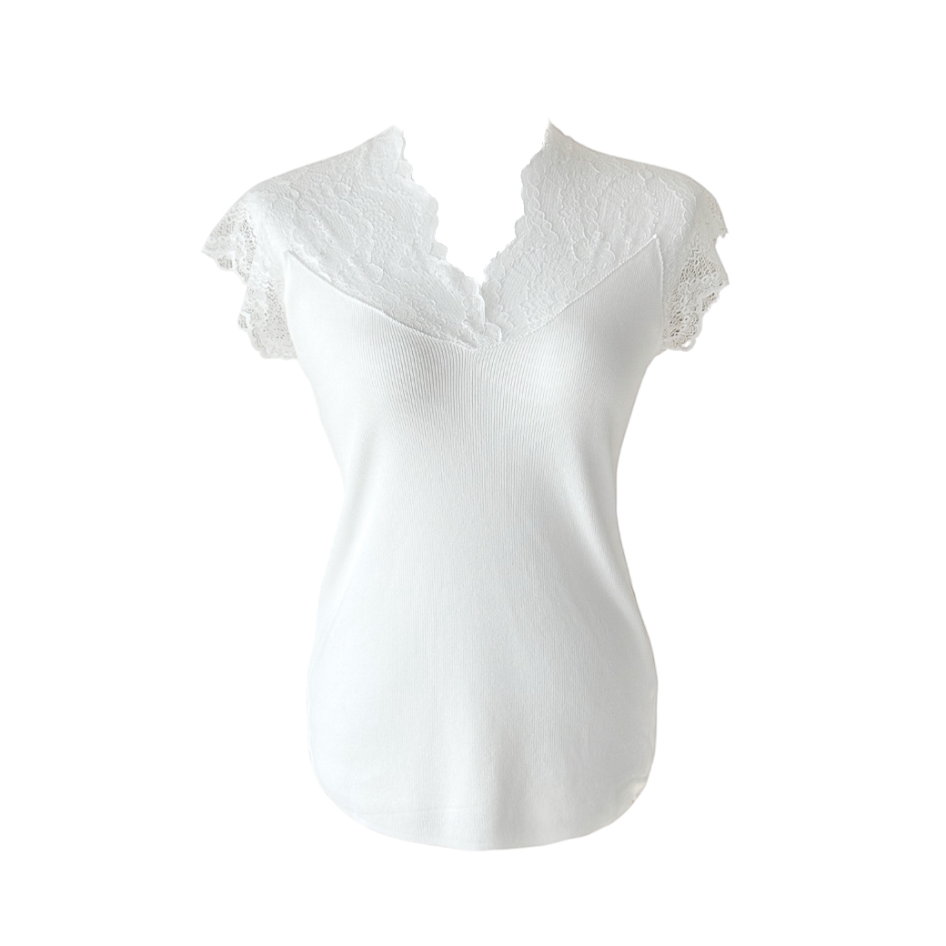 어깨와 소매 부분에 정교한 레이스 원단을 배치하여 시각적인 포인트와 통기성을 동시에 확보한 반팔 탑입니다.