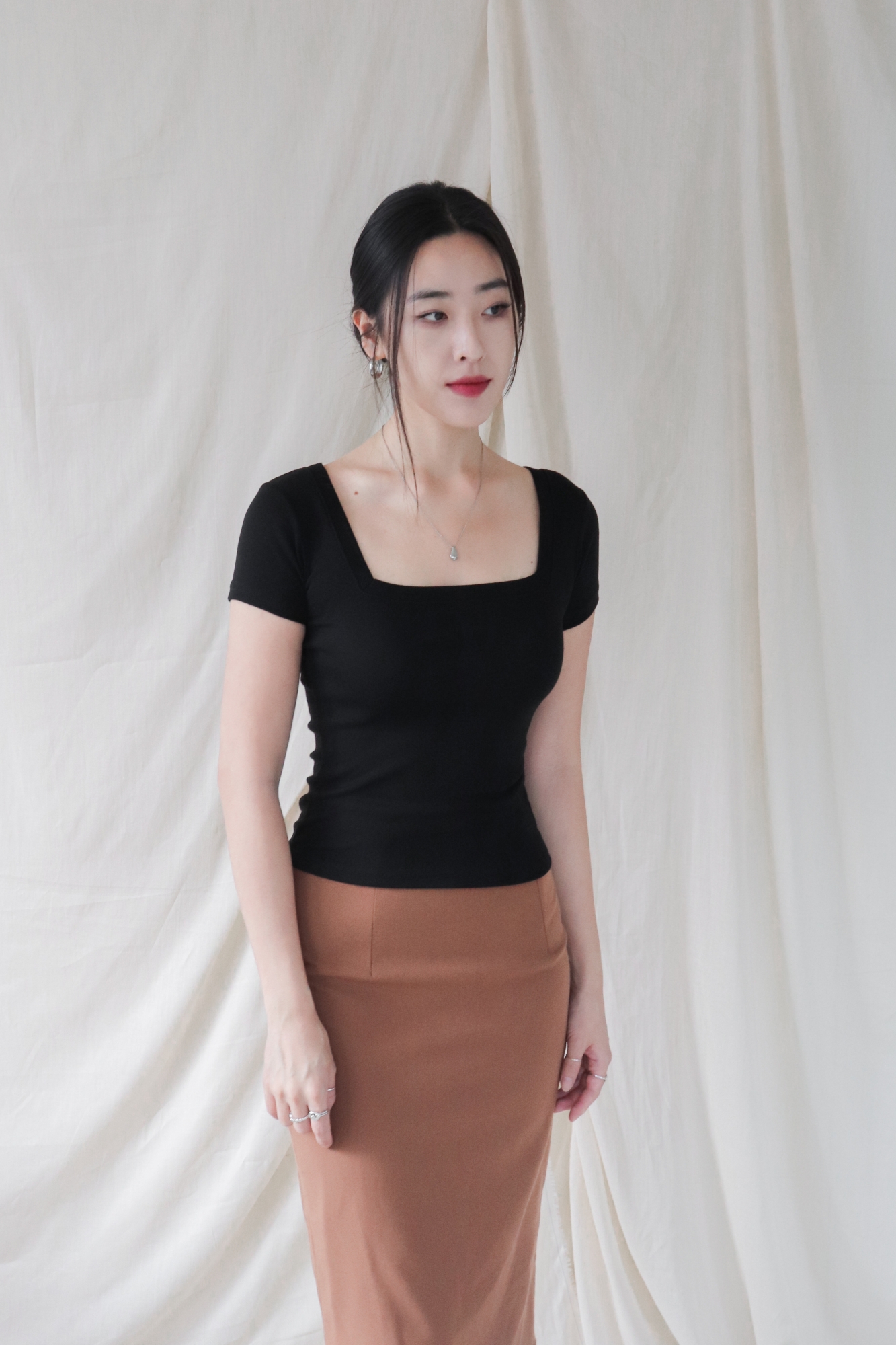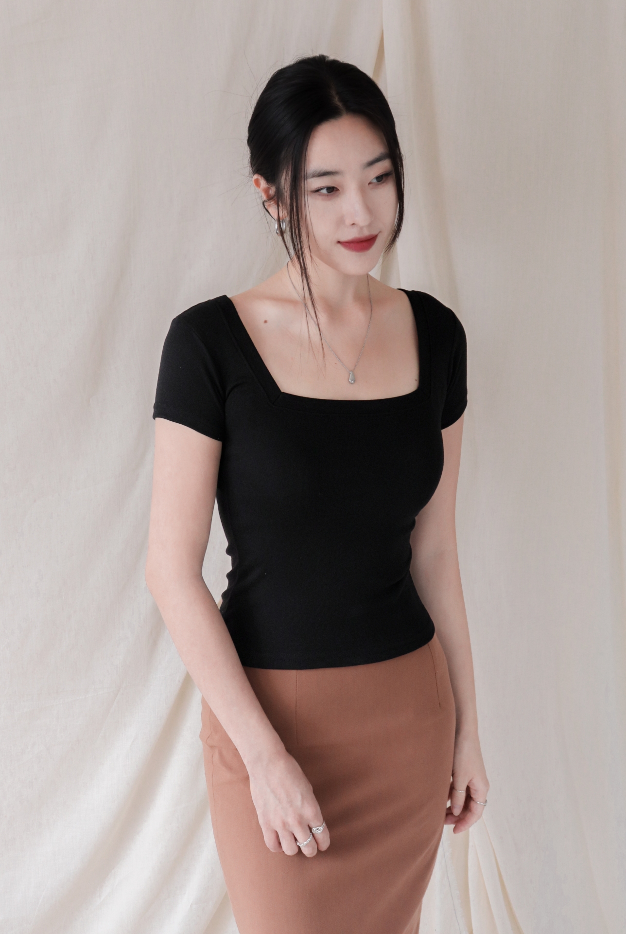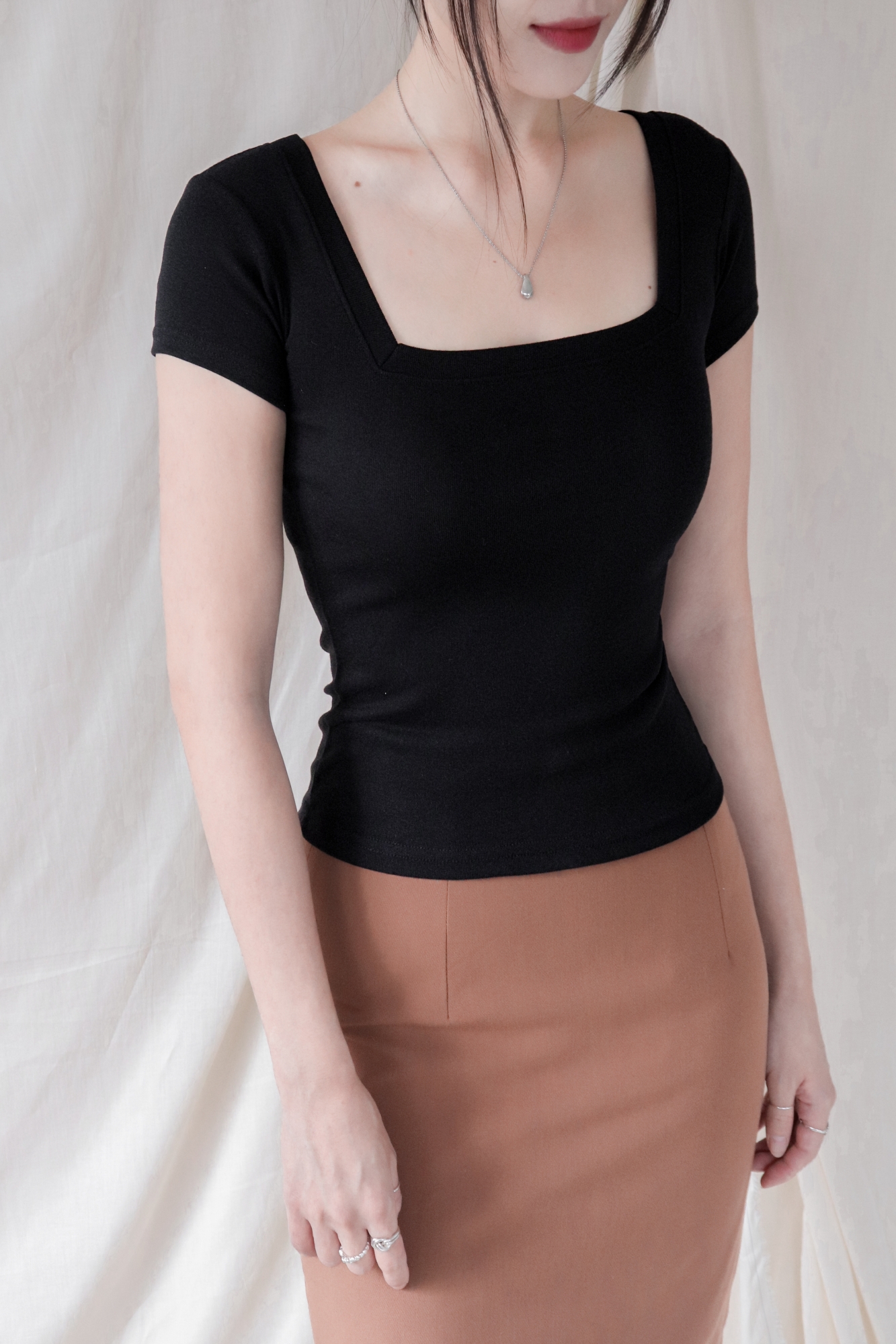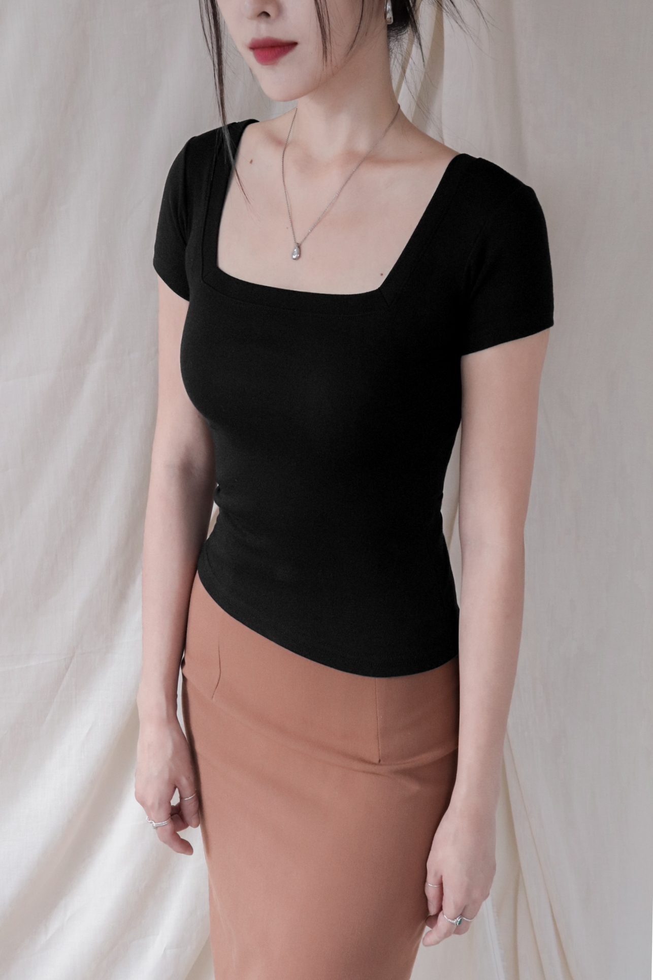 스퀘어넥은 쇄골과 목선을 깔끔하게 드러내며 페미닌한 무드를 강조합니다.