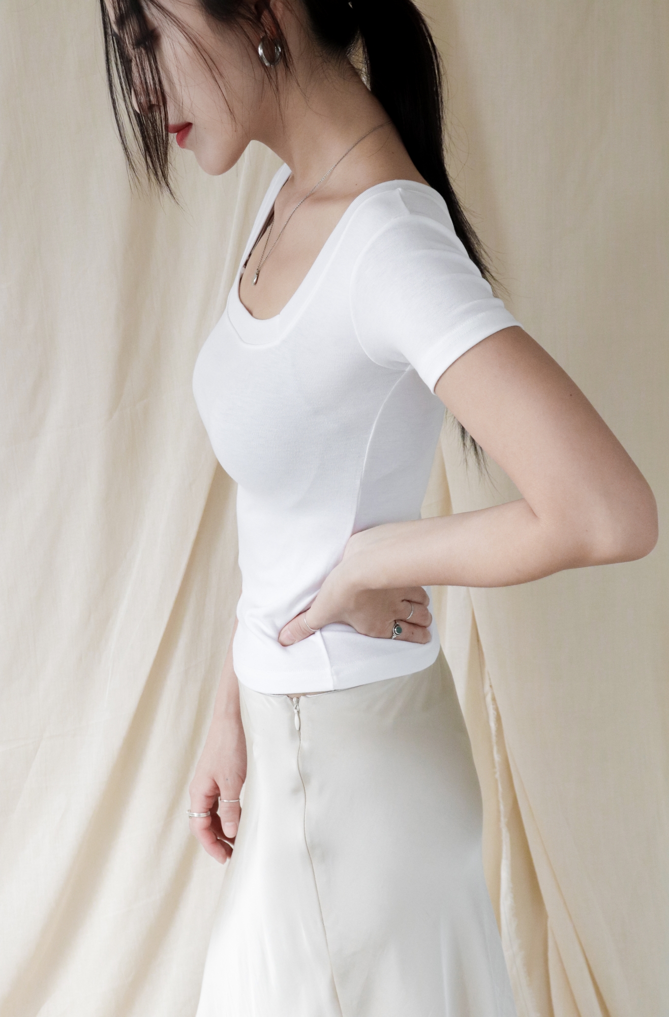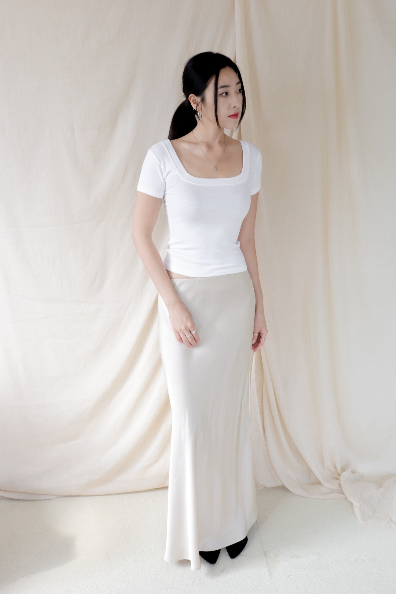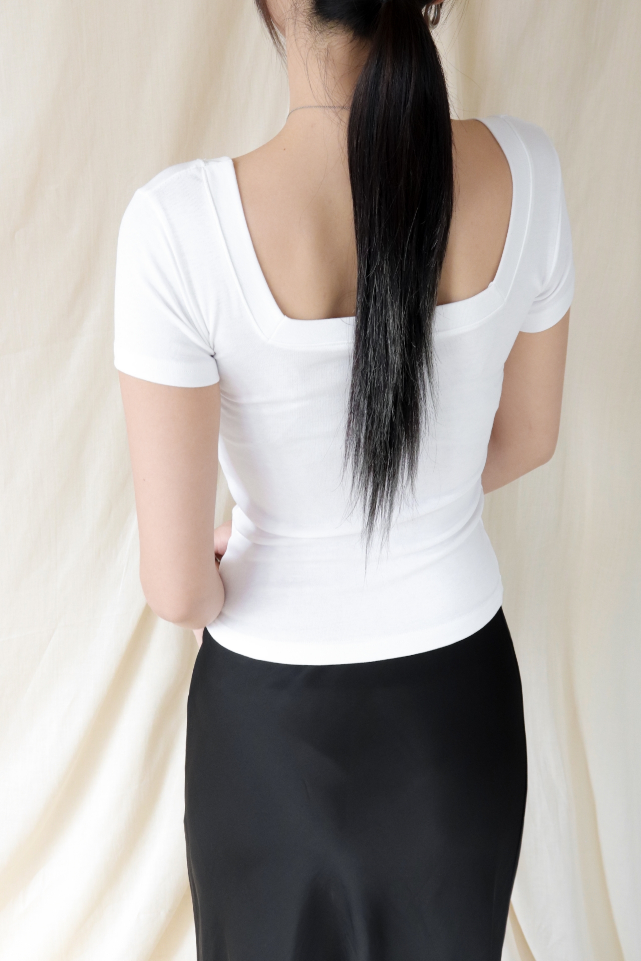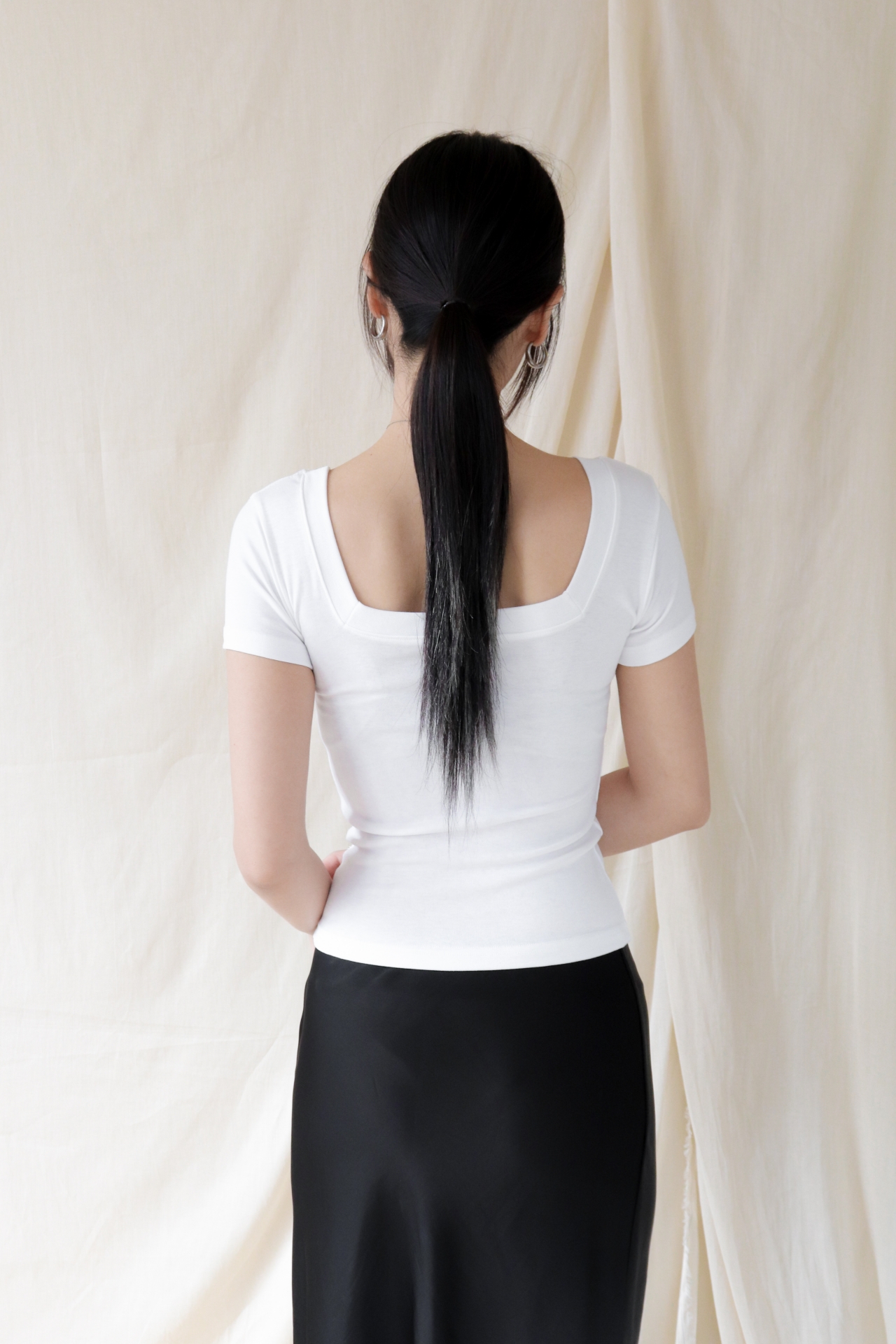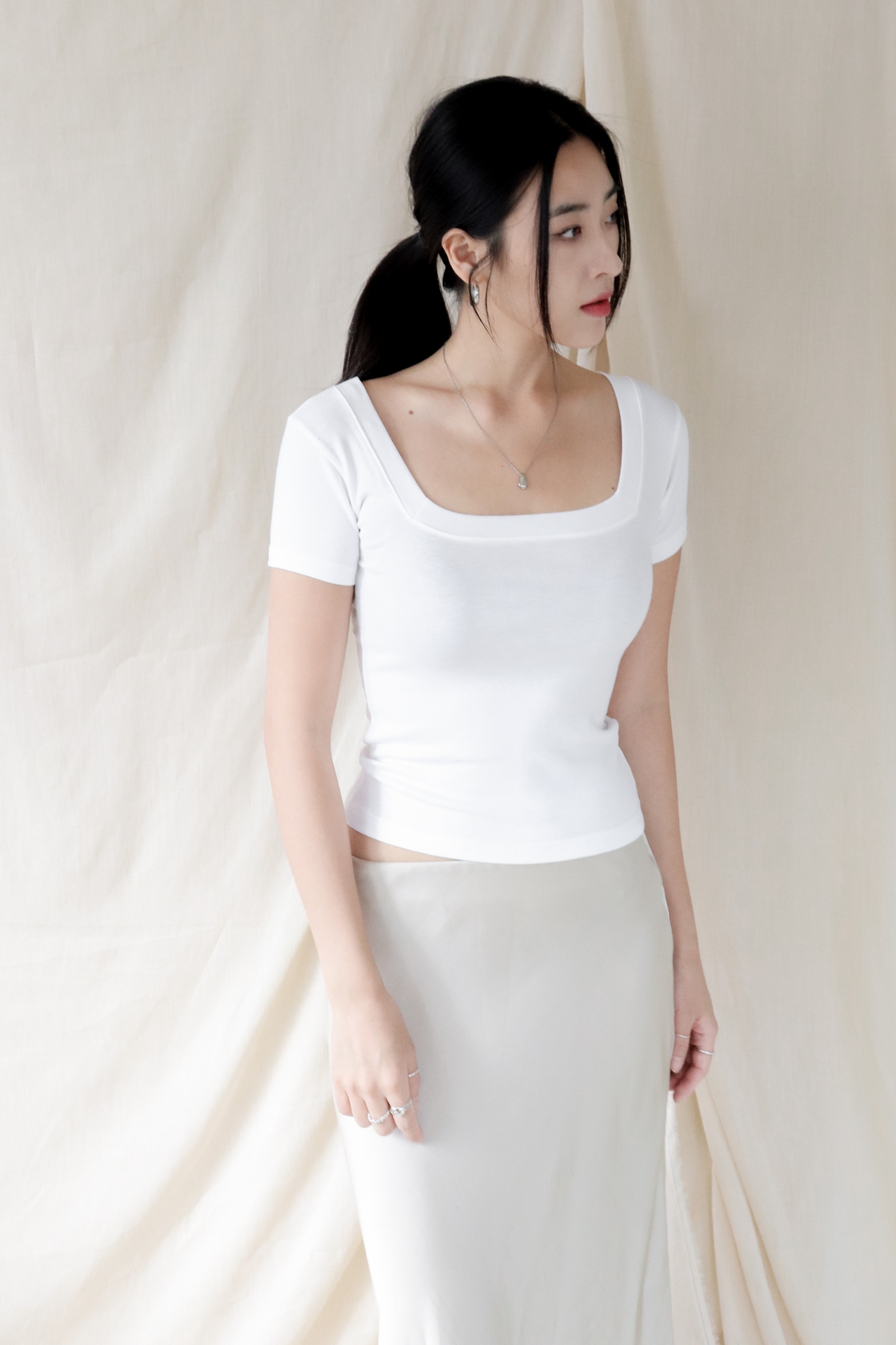 스퀘어넥은 쇄골과 목선을 깔끔하게 드러내며 페미닌한 무드를 강조합니다.