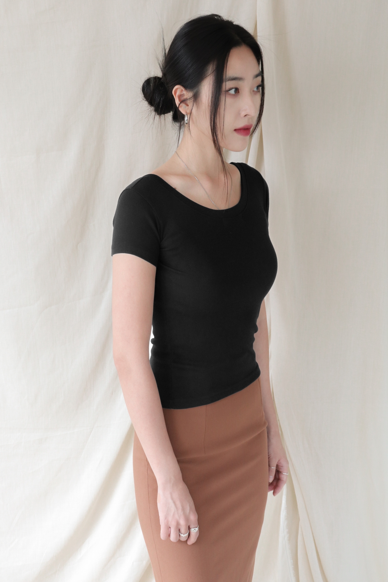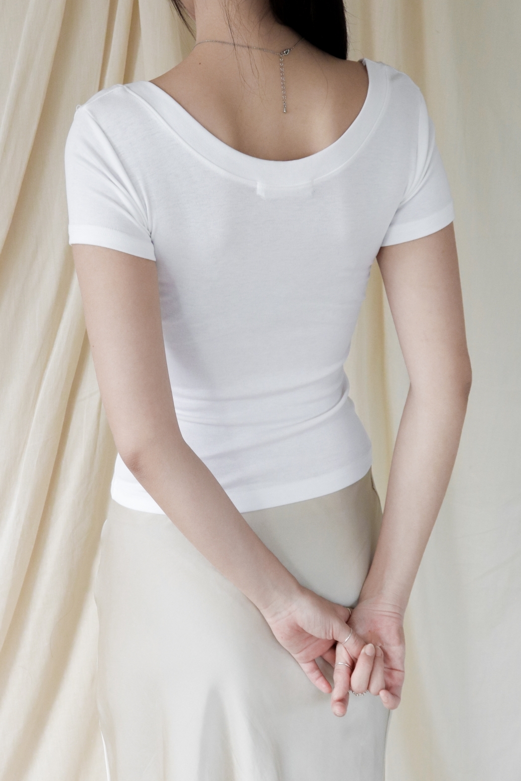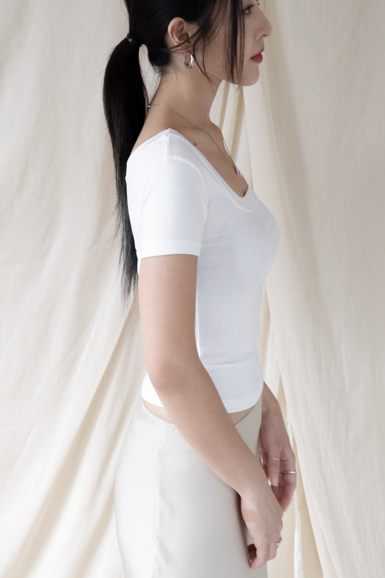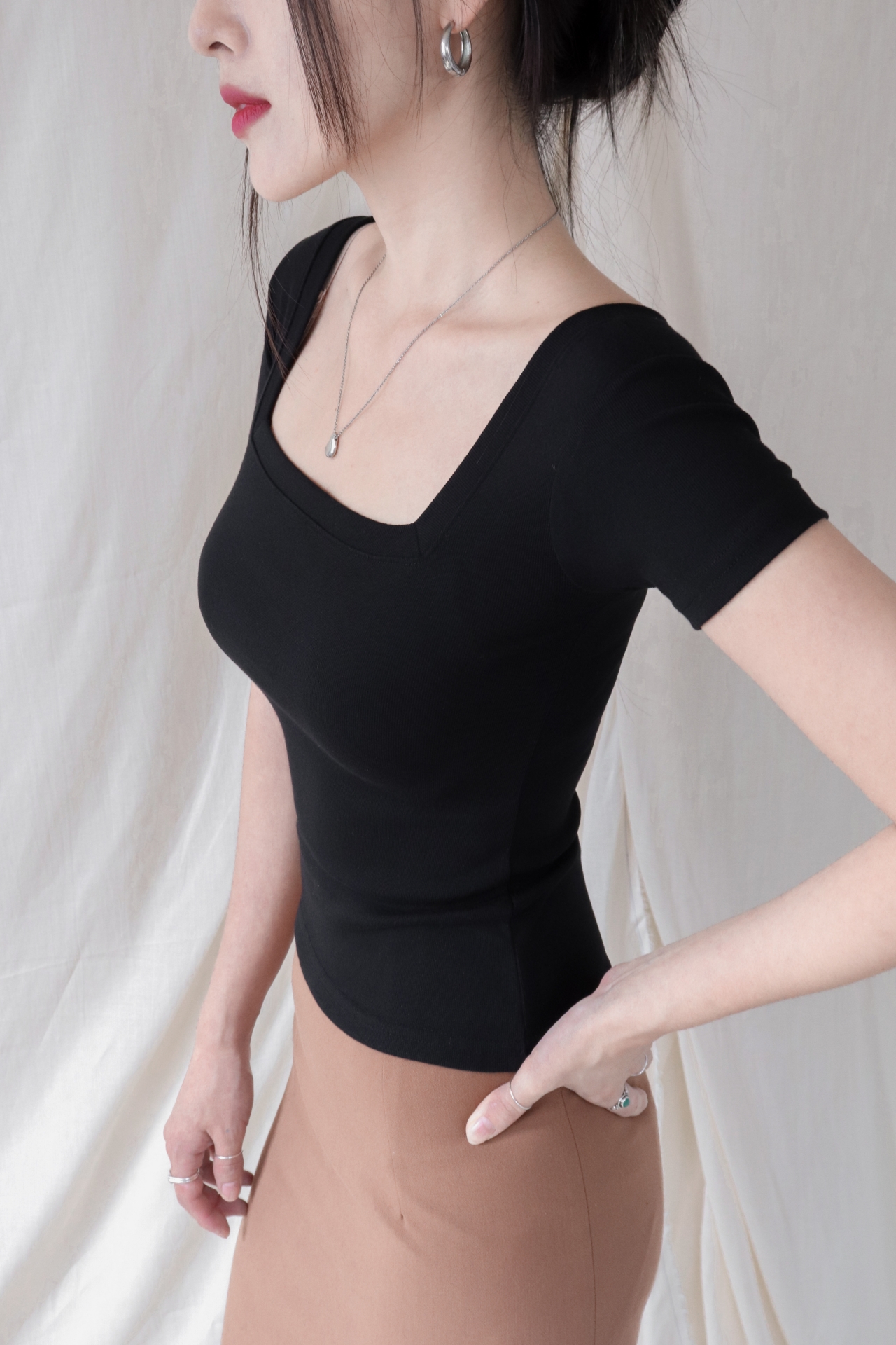스퀘어넥은 쇄골과 목선을 깔끔하게 드러내며 페미닌한 무드를 강조합니다.