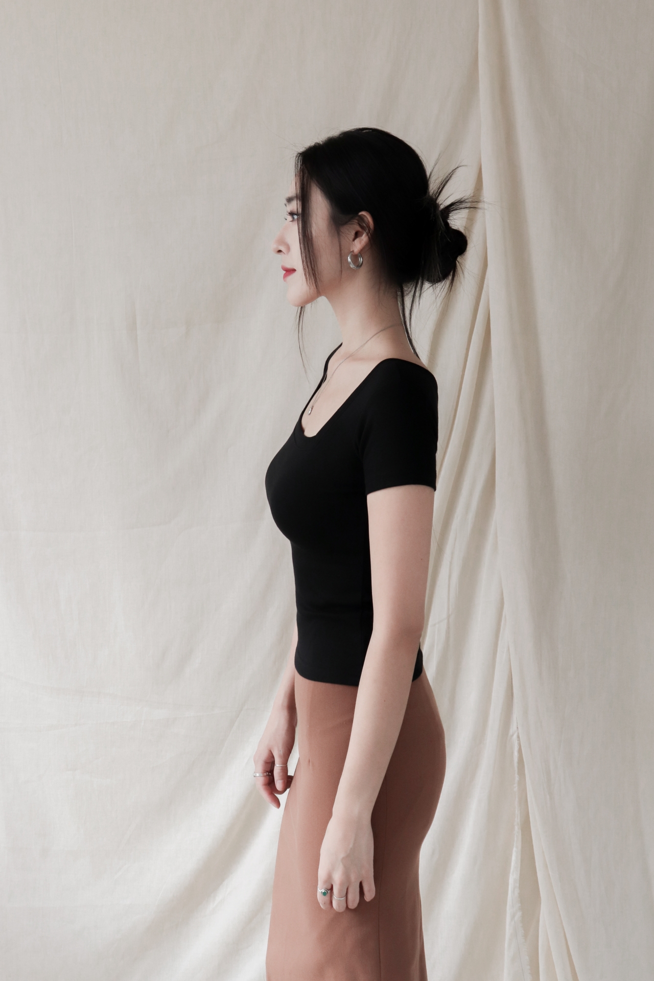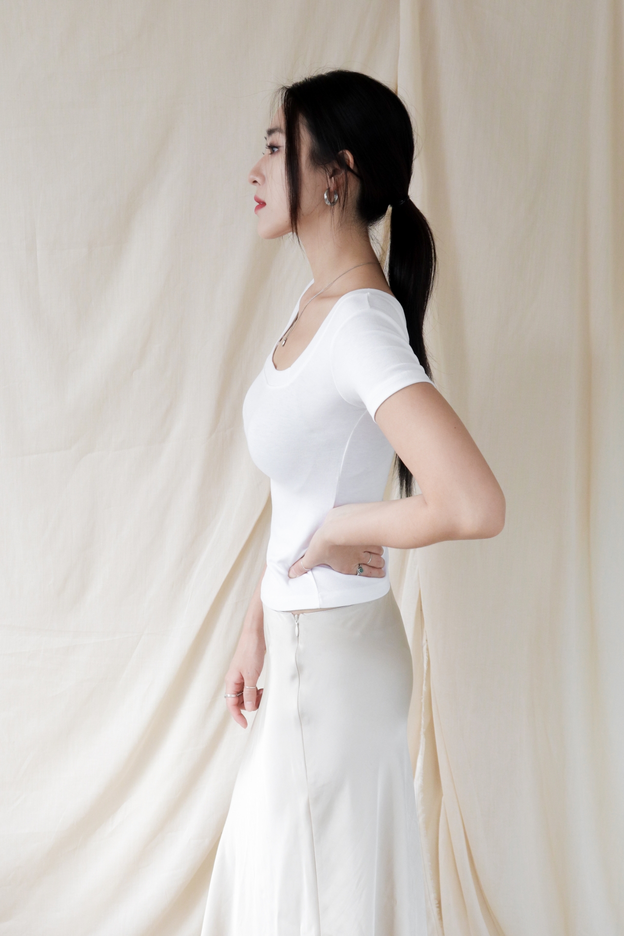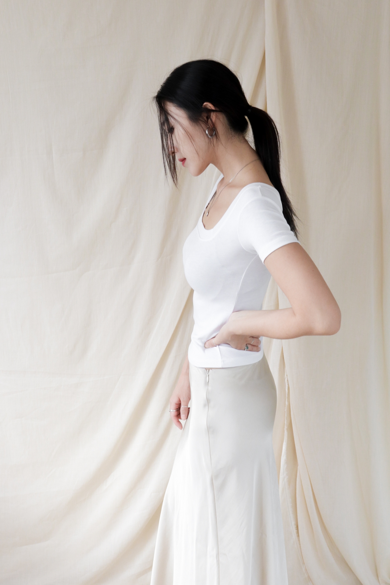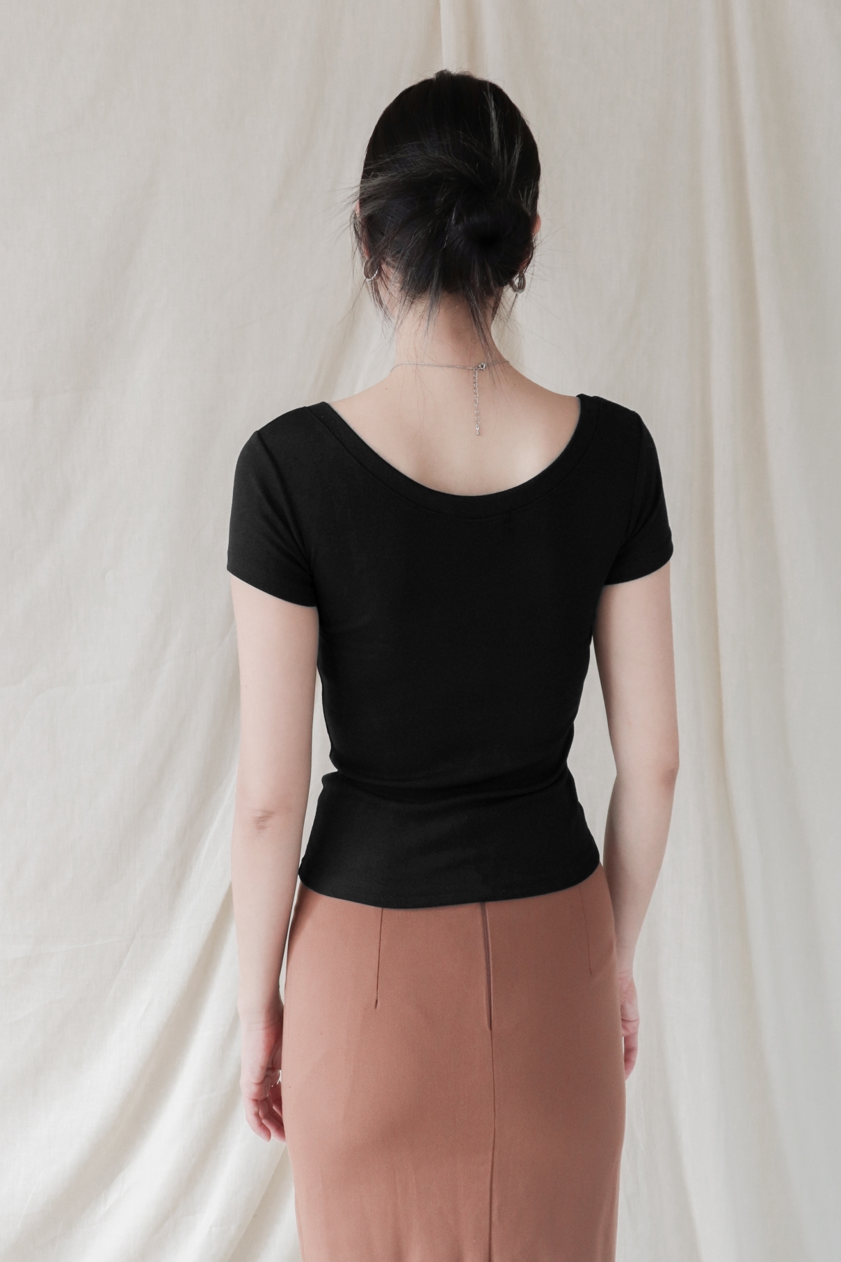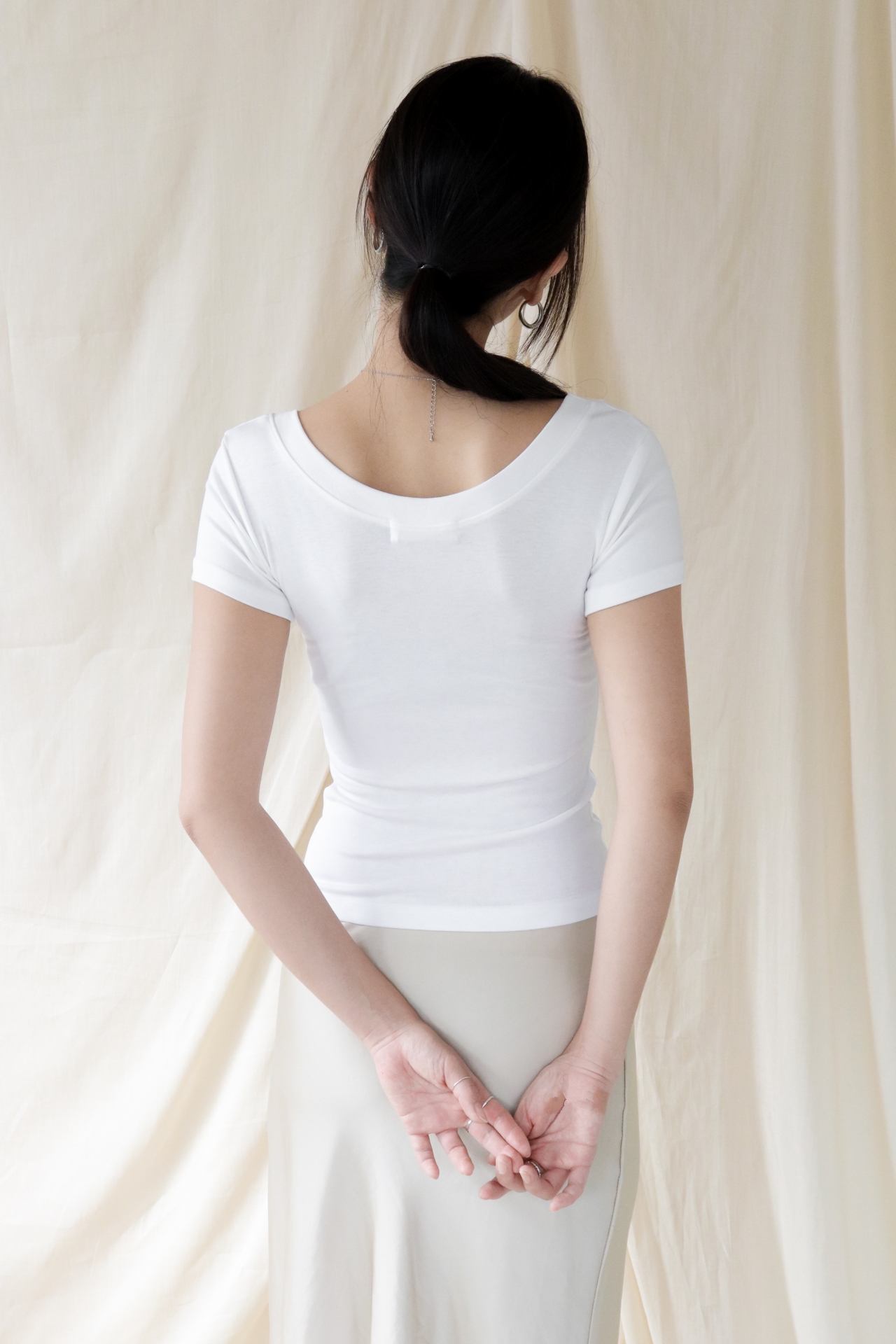 스퀘어넥은 쇄골과 목선을 깔끔하게 드러내며 페미닌한 무드를 강조합니다.