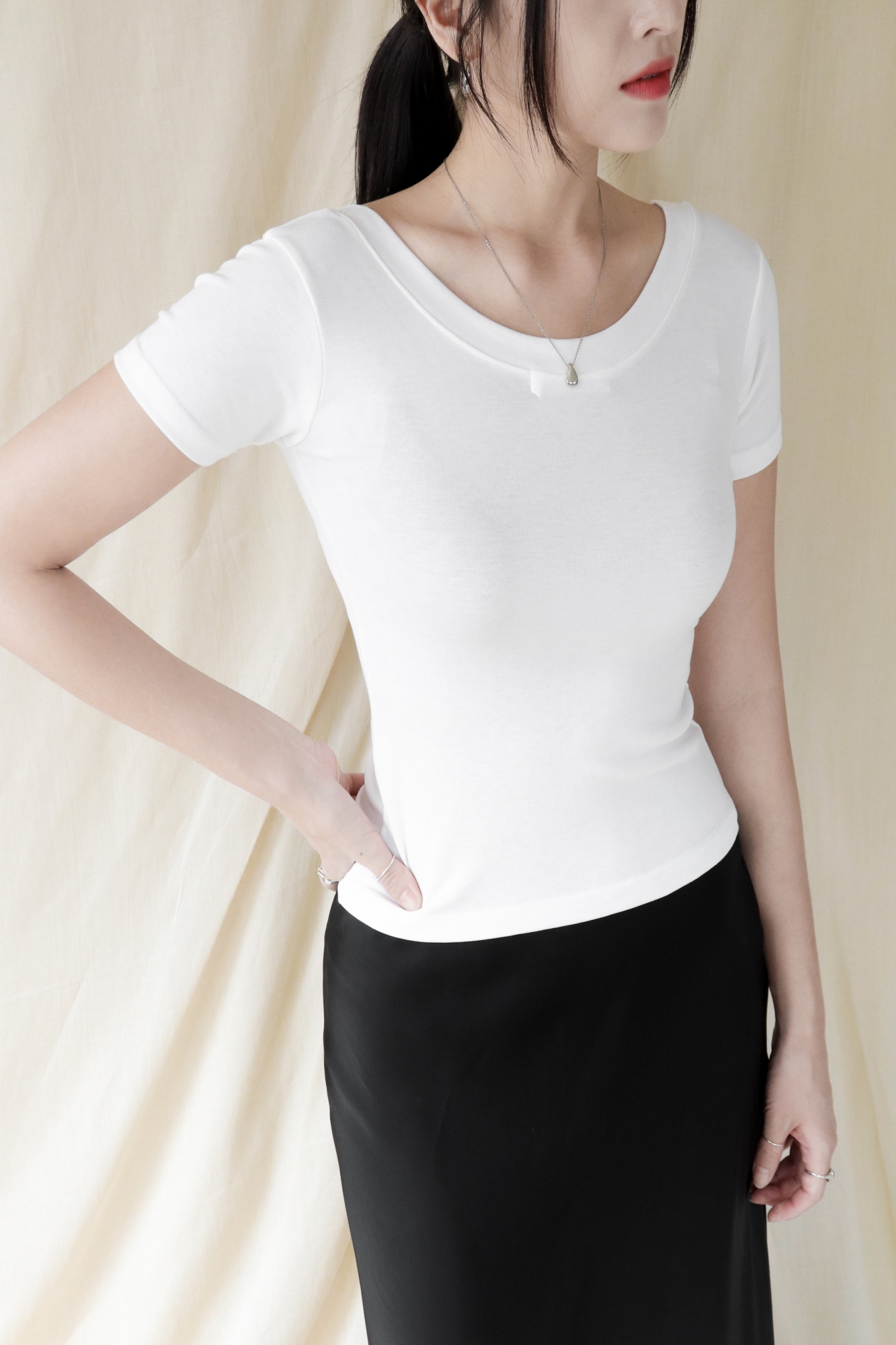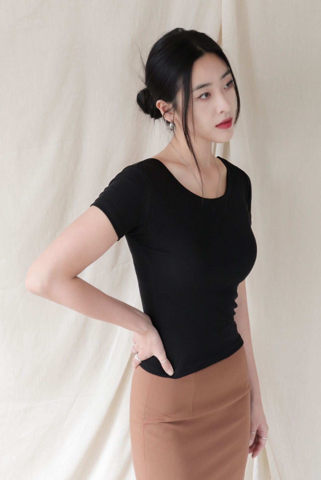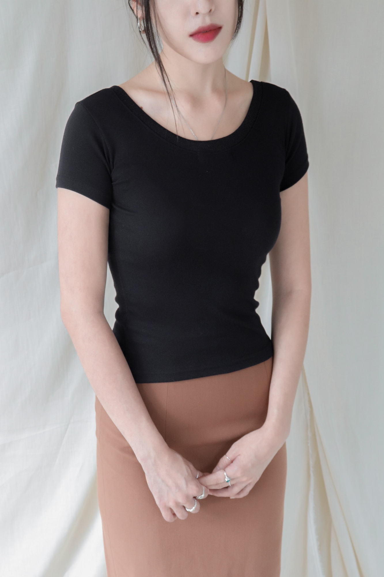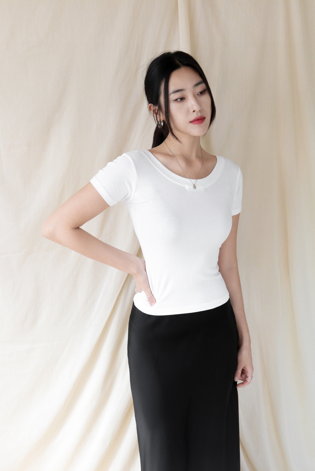 라운드넥은 부드럽고 단정한 인상으로 다양한 스타일에 매치하기 좋습니다.