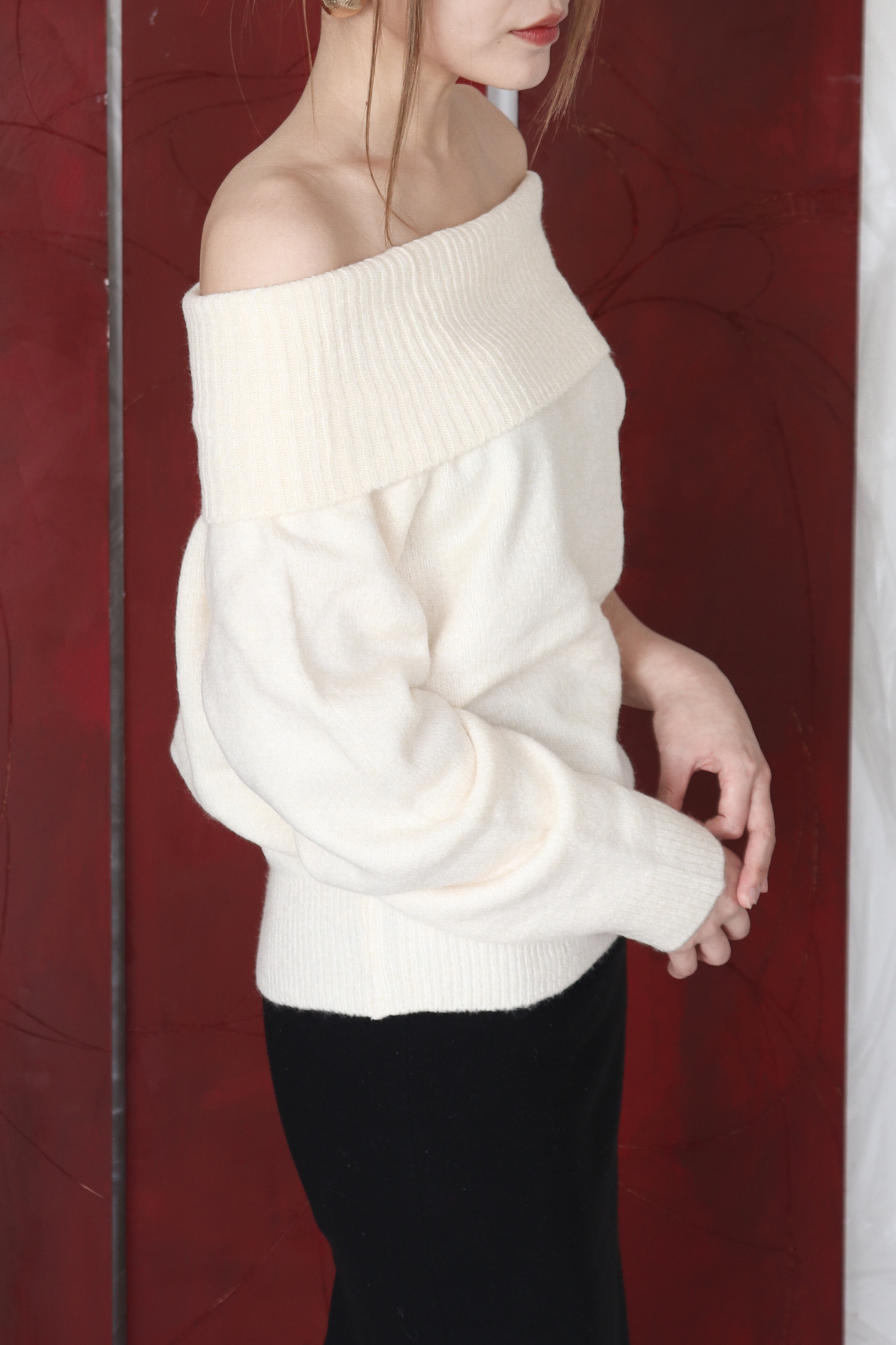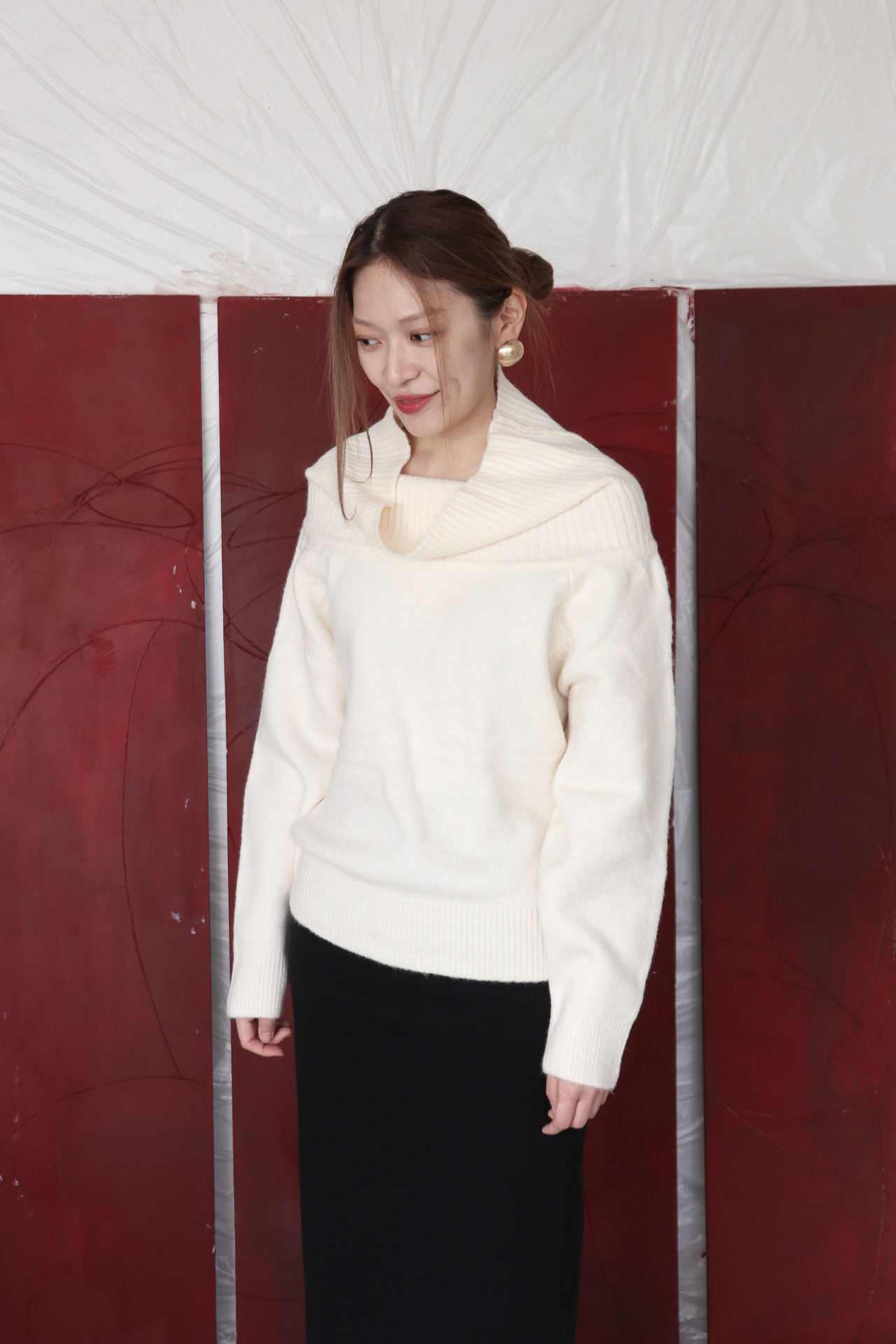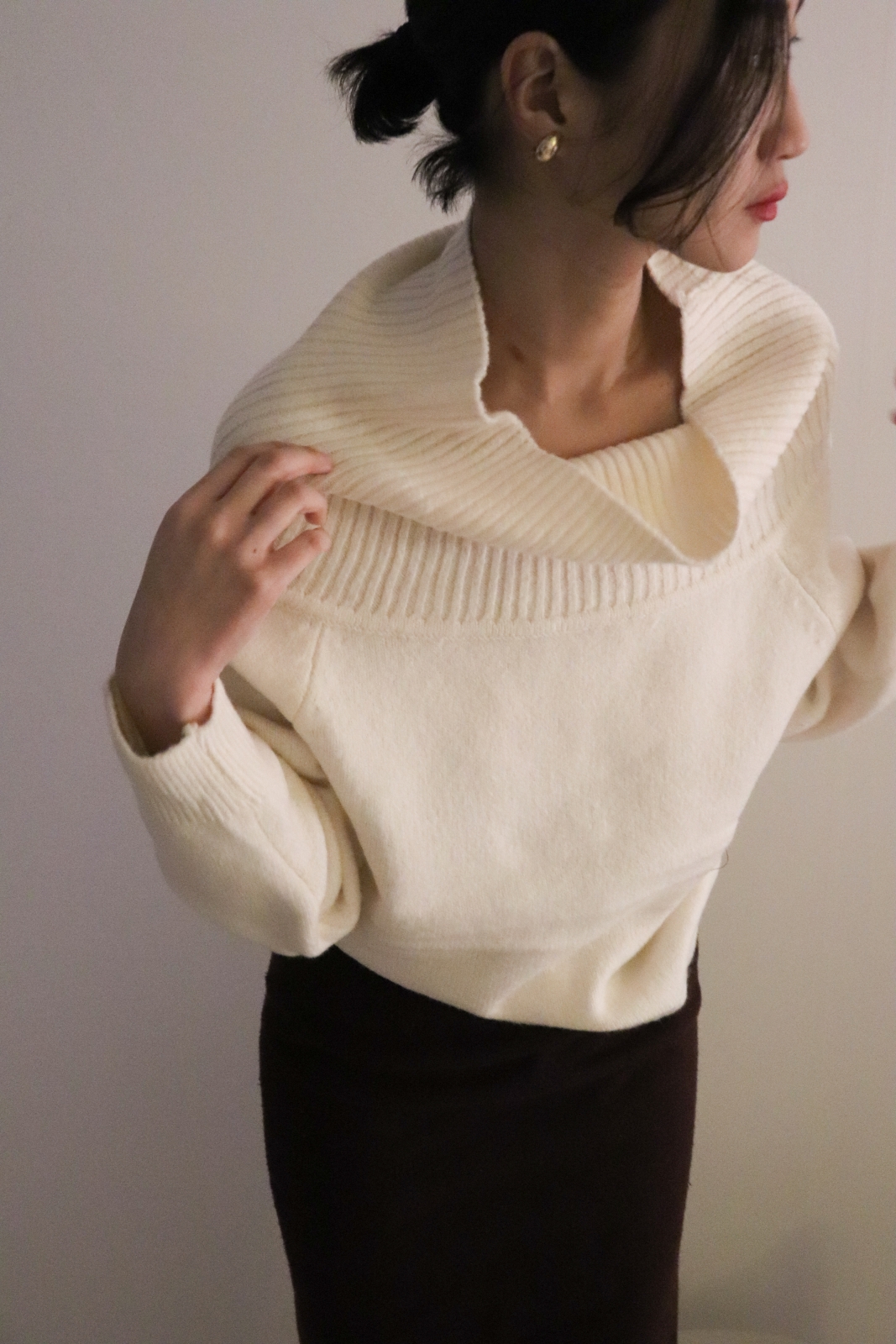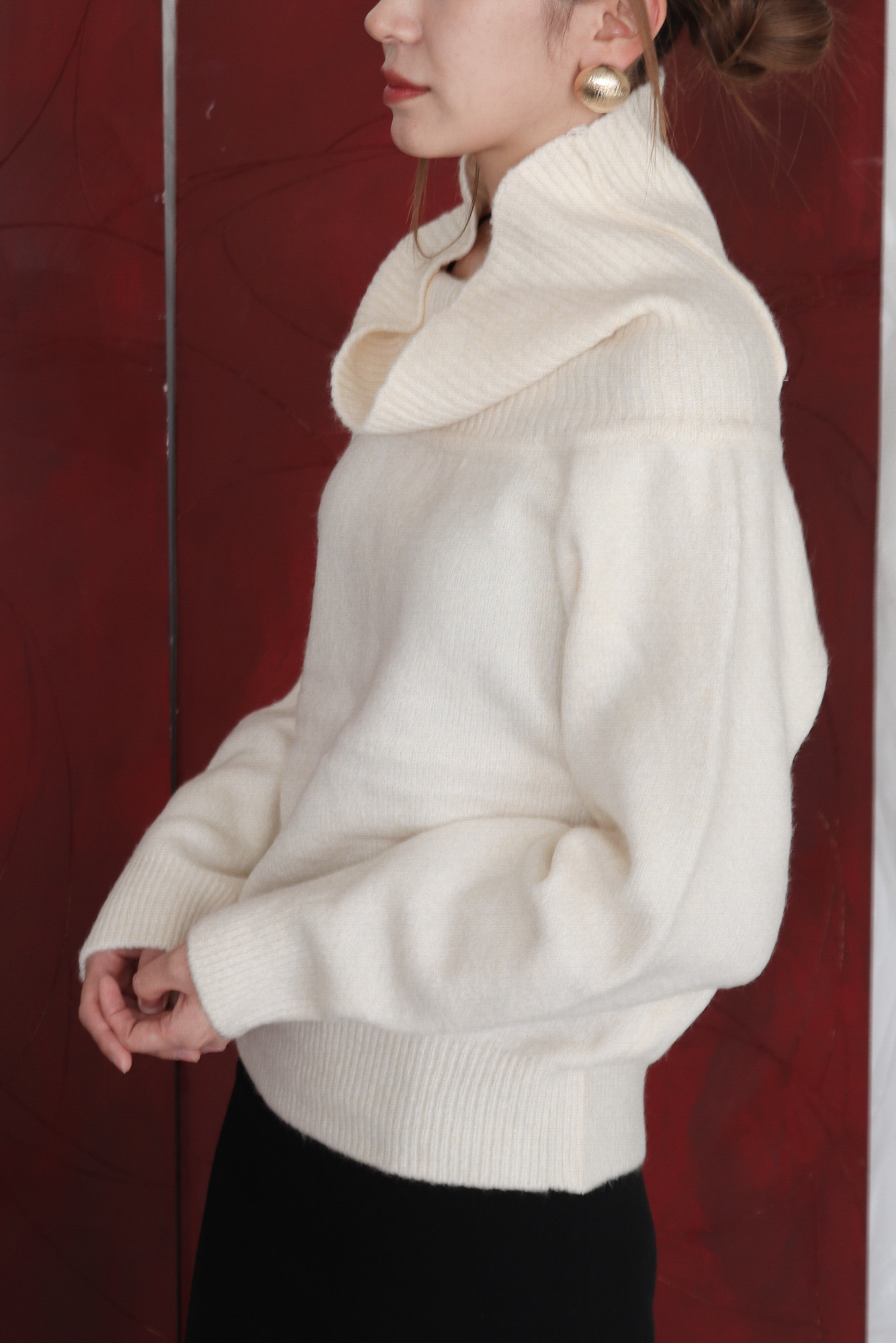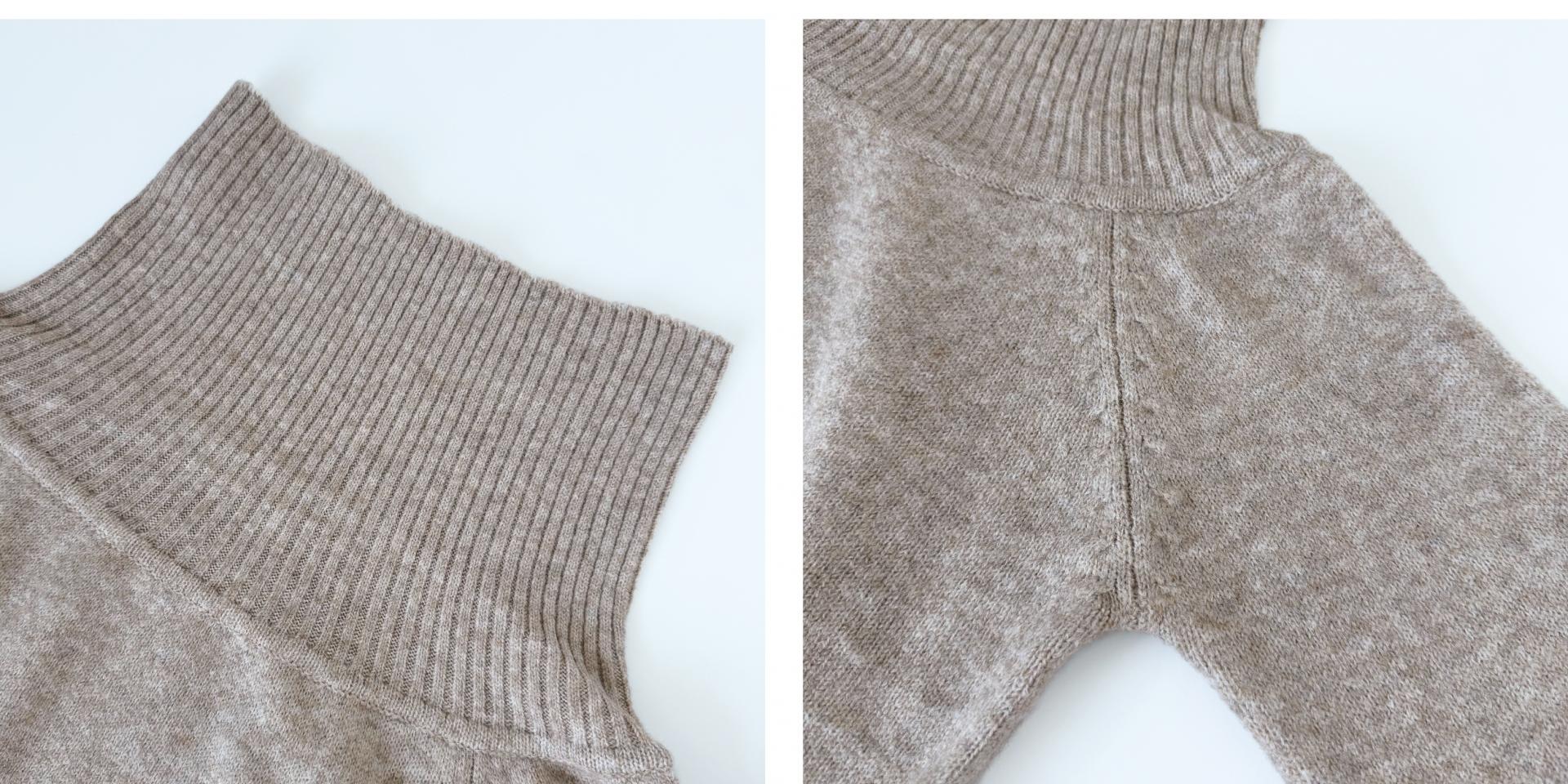 넓게 접힌 네크라인은 스타일에 따라 터틀넥 또는 오프숄더로 연출 가능해 하나의 아이템으로 전혀 다른 두 가지 무드를 즐길 수 있습니다.