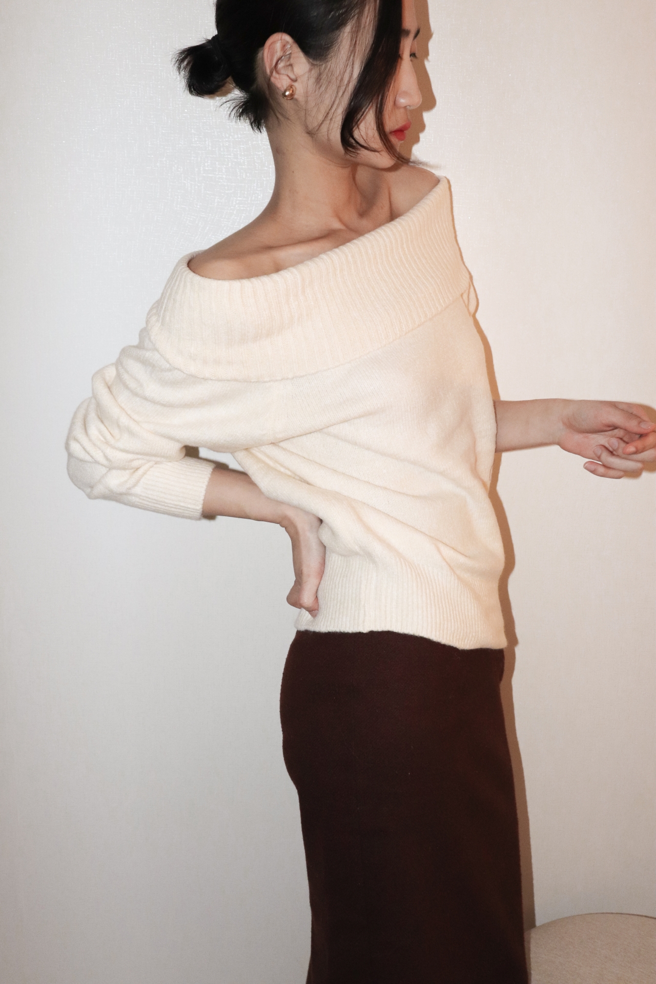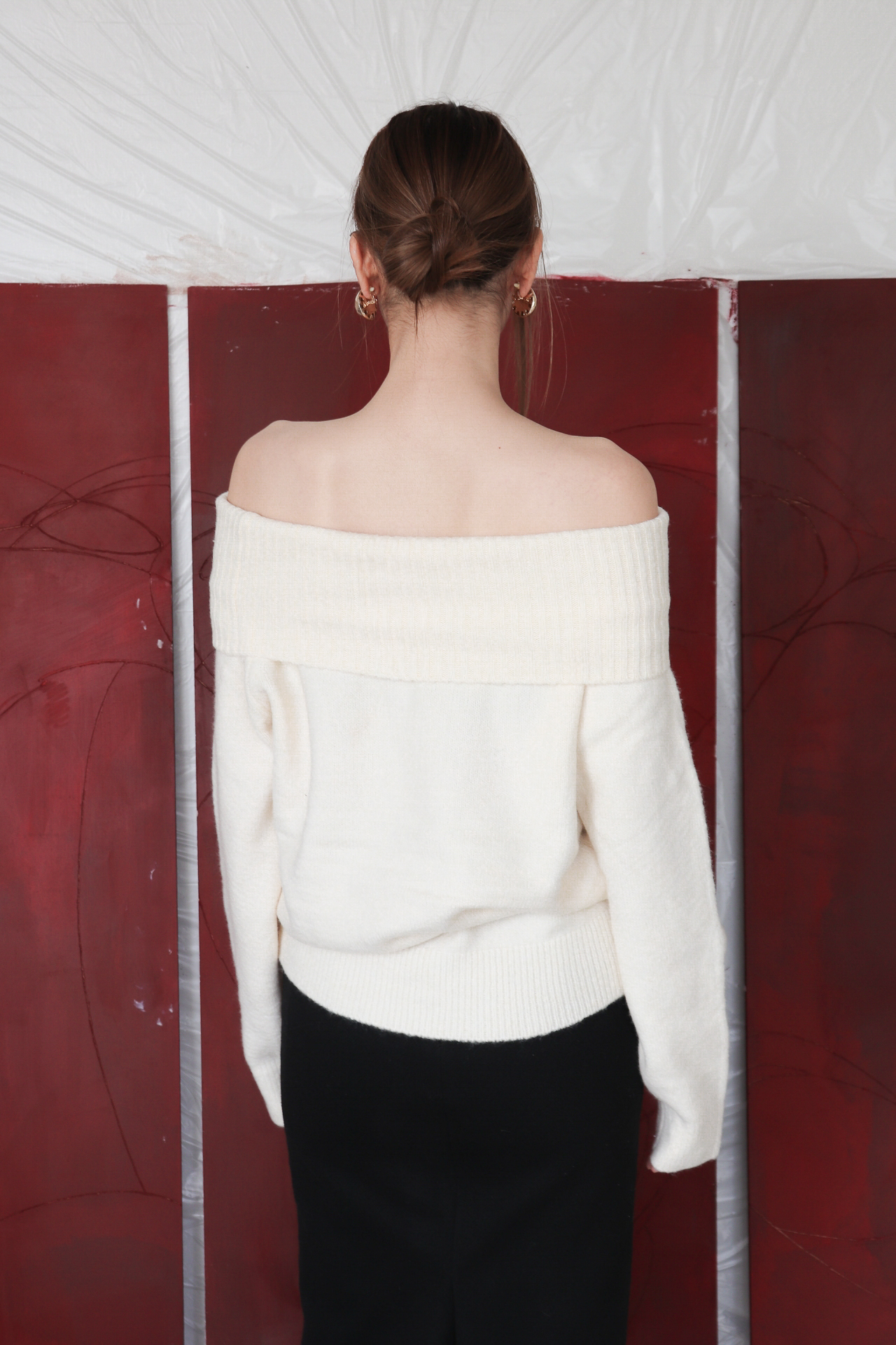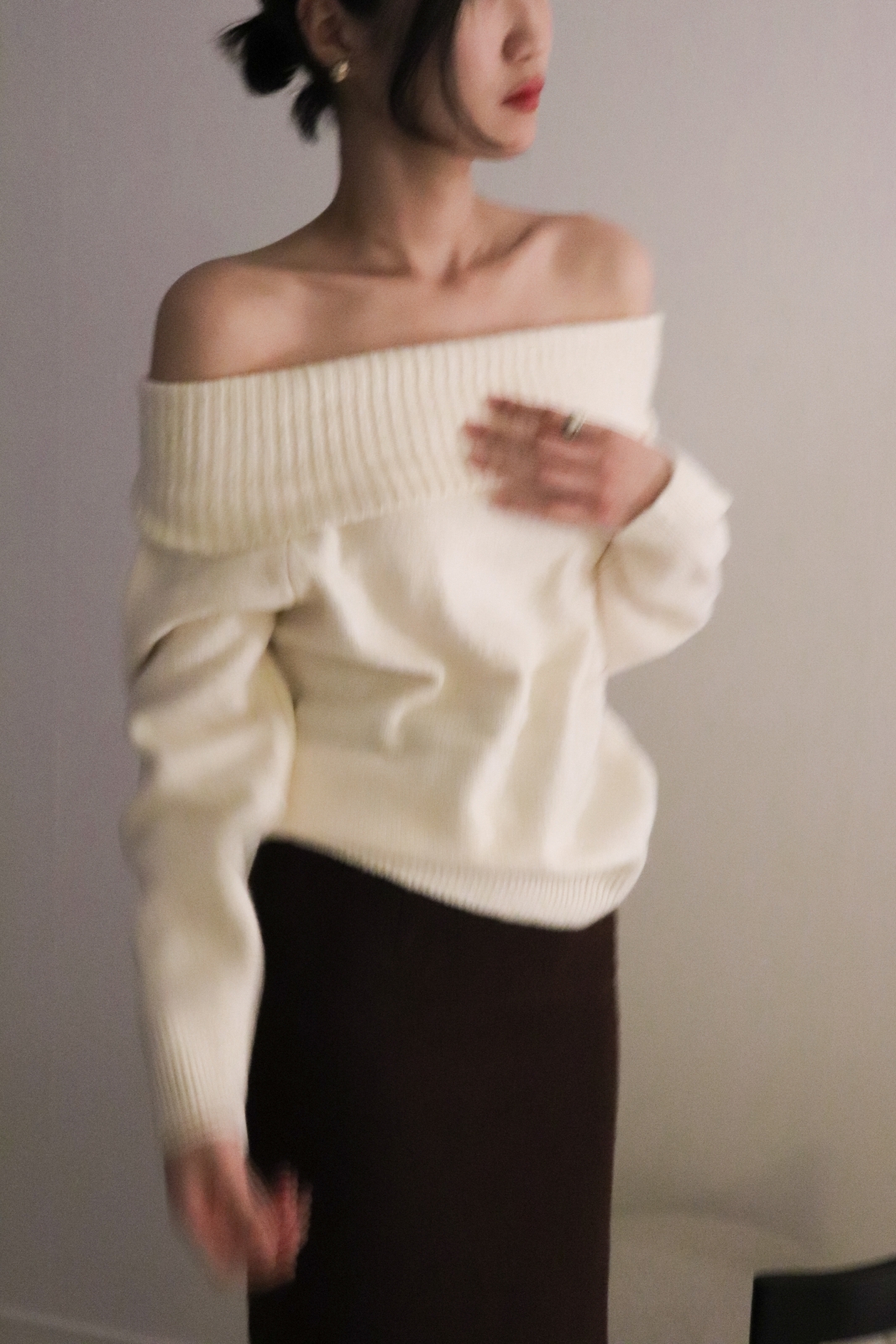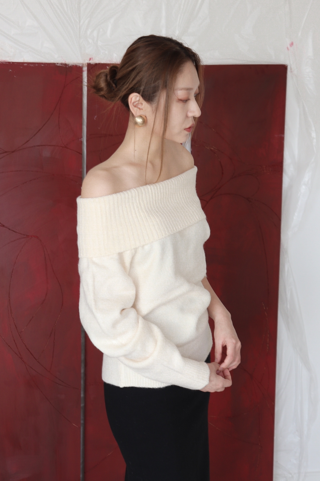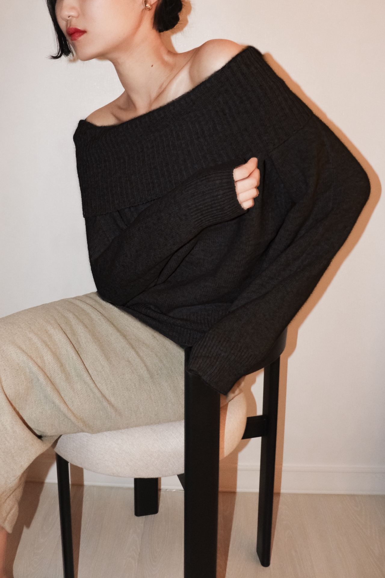 넓게 접힌 네크라인은 스타일에 따라 터틀넥 또는 오프숄더로 연출 가능해 하나의 아이템으로 전혀 다른 두 가지 무드를 즐길 수 있습니다.