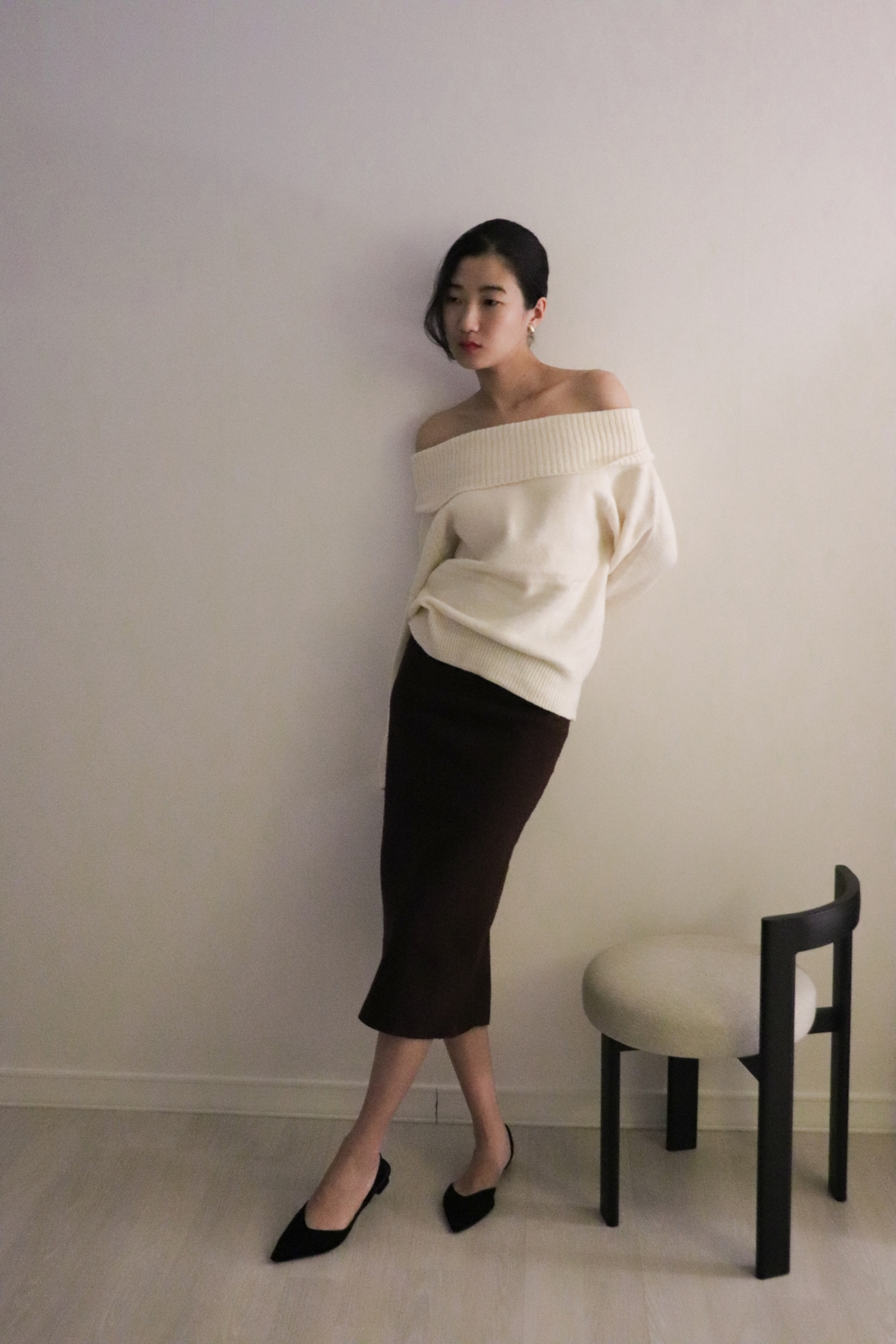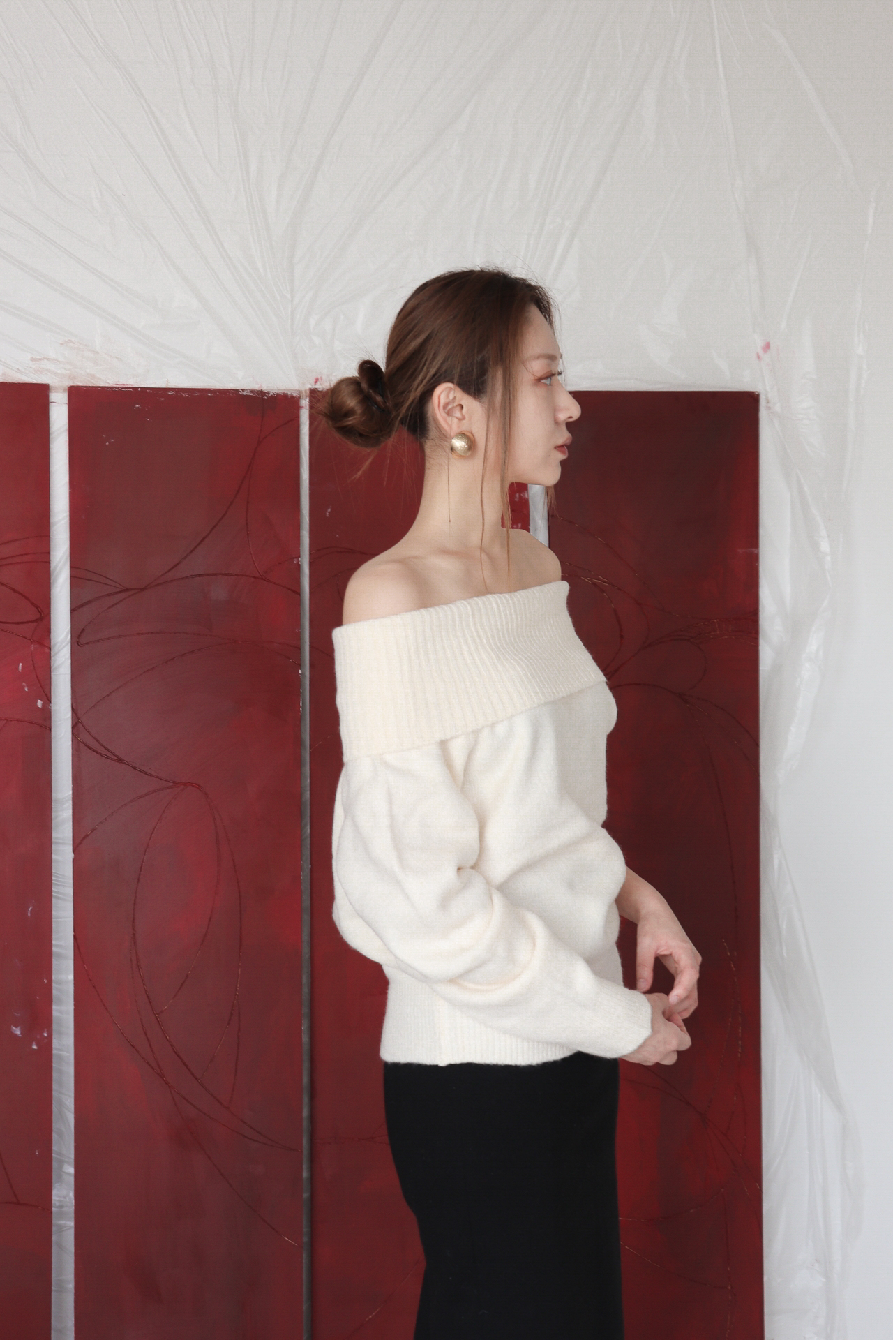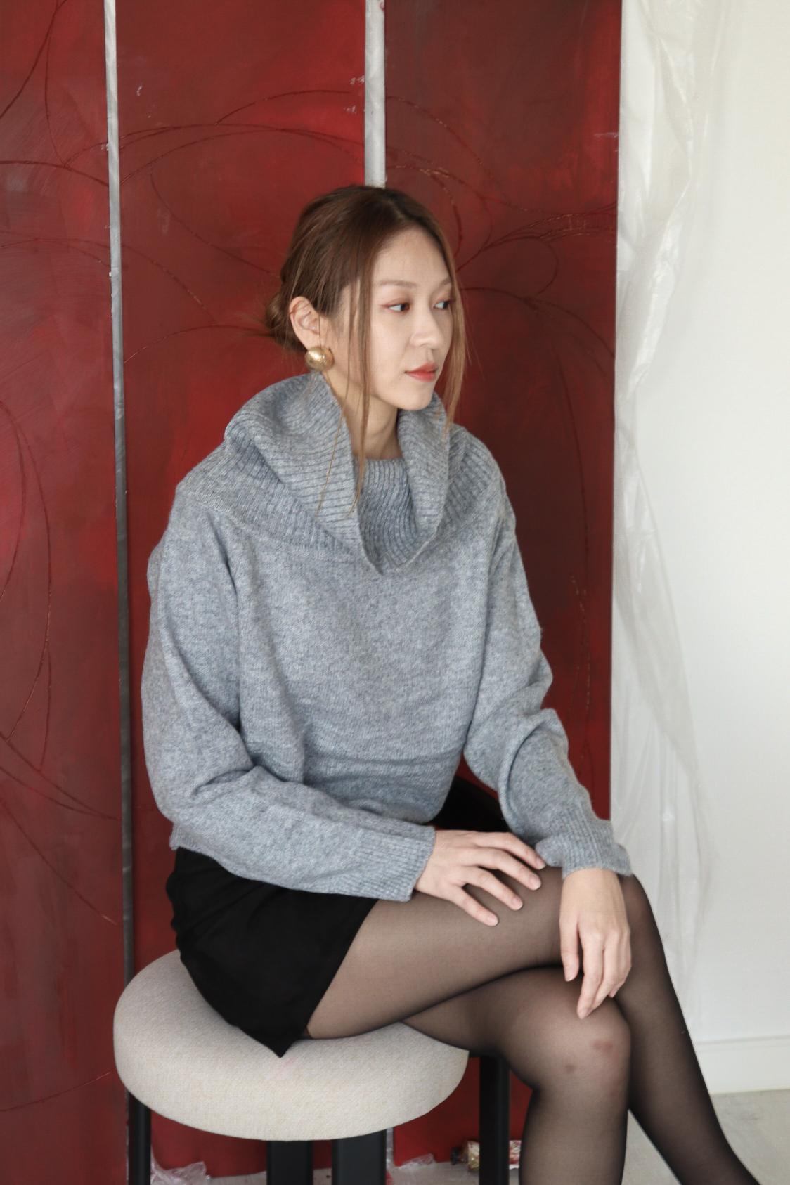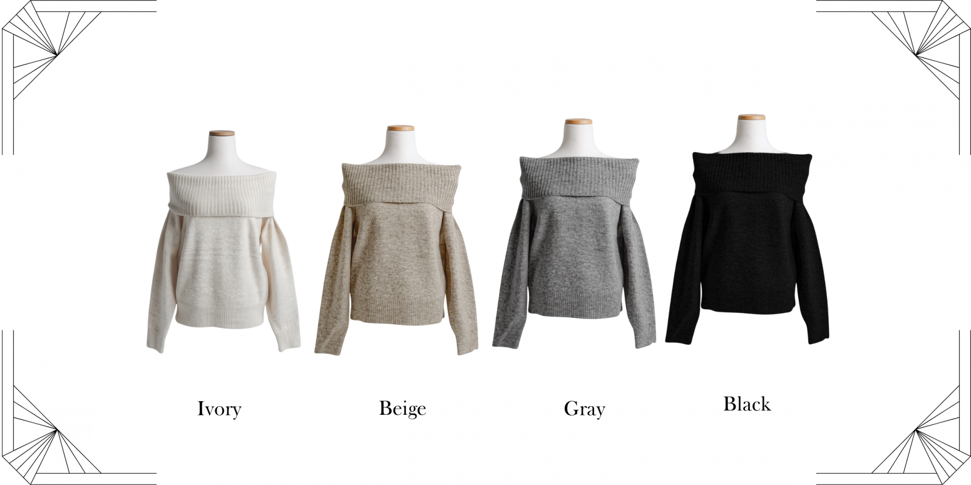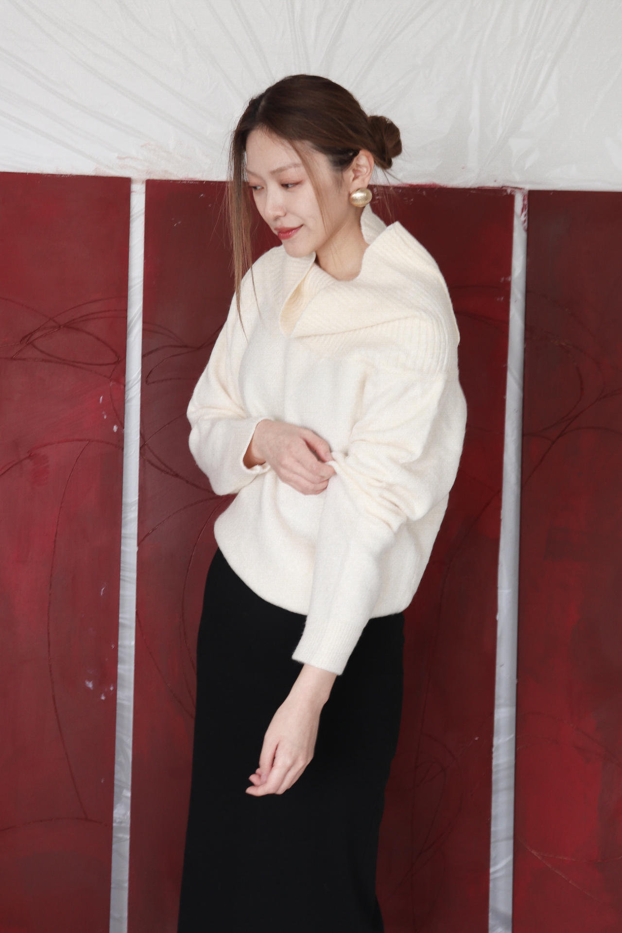 넓게 접힌 네크라인은 스타일에 따라 터틀넥 또는 오프숄더로 연출 가능해 하나의 아이템으로 전혀 다른 두 가지 무드를 즐길 수 있습니다.