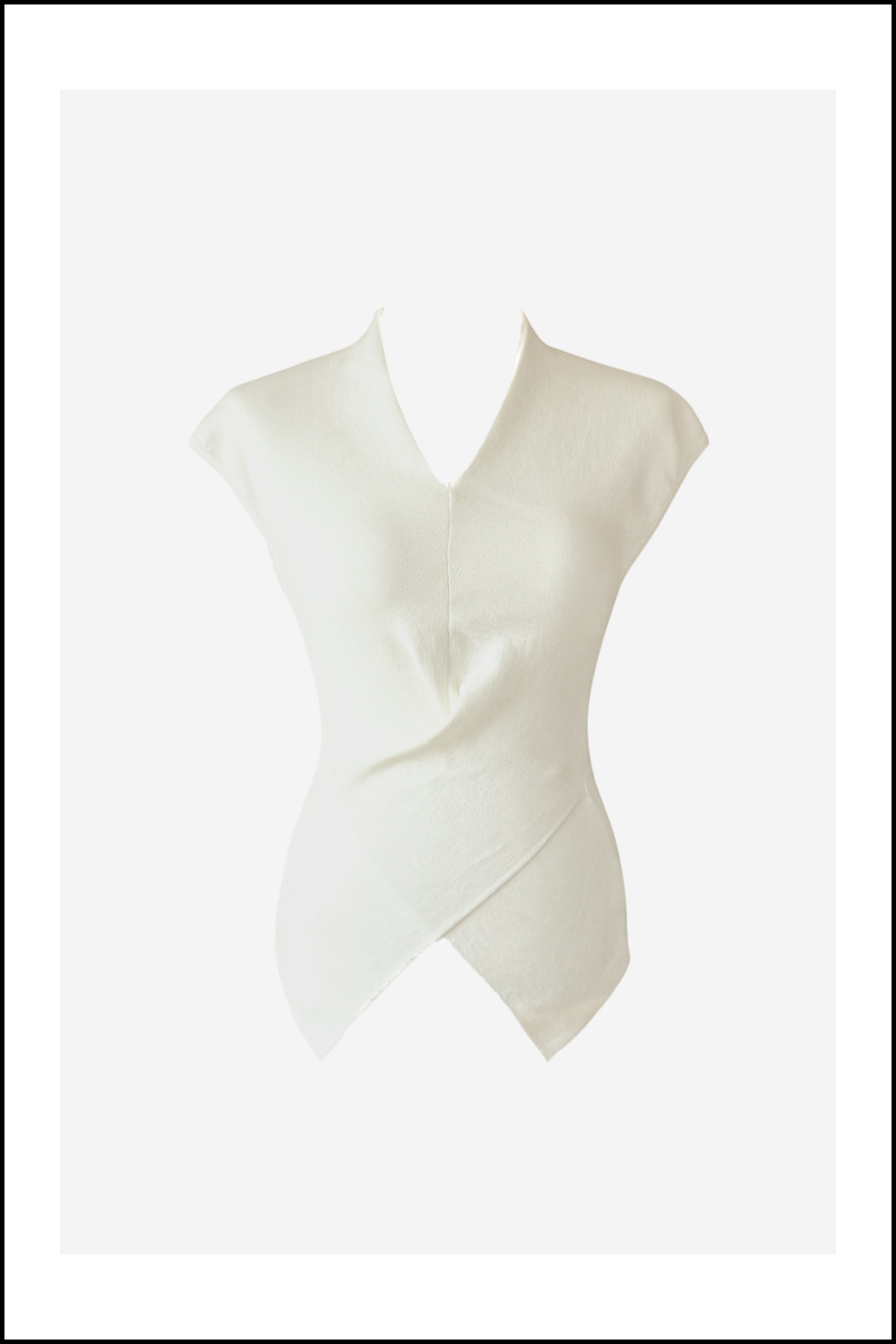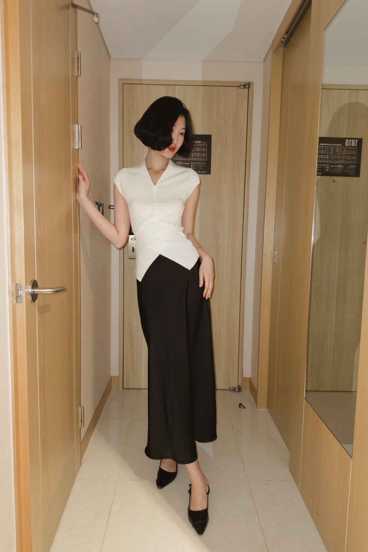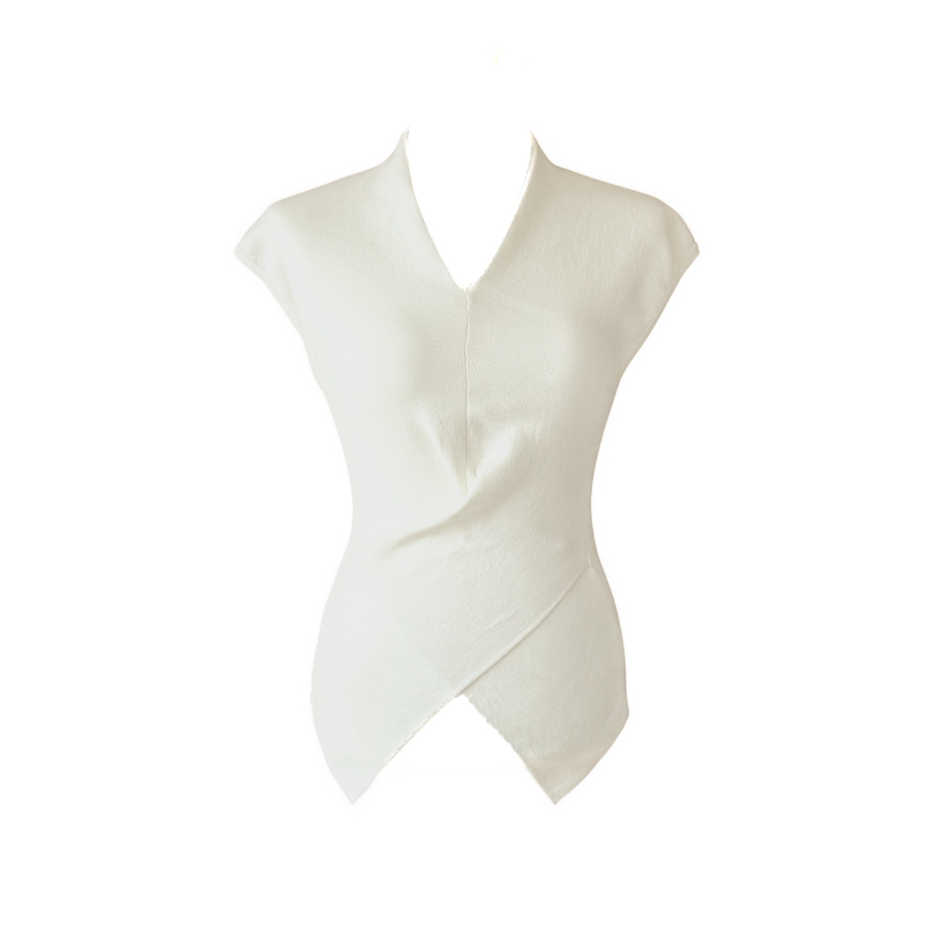 넥라인은 적당히 파인 브이 형태로 목선을 길어 보이게 하며, 가녀린 상체를 강조합니다.