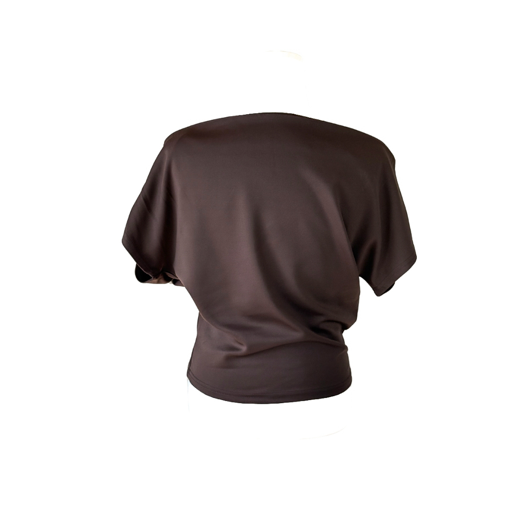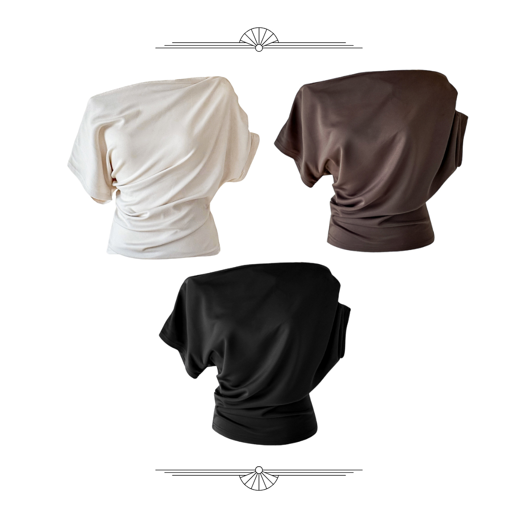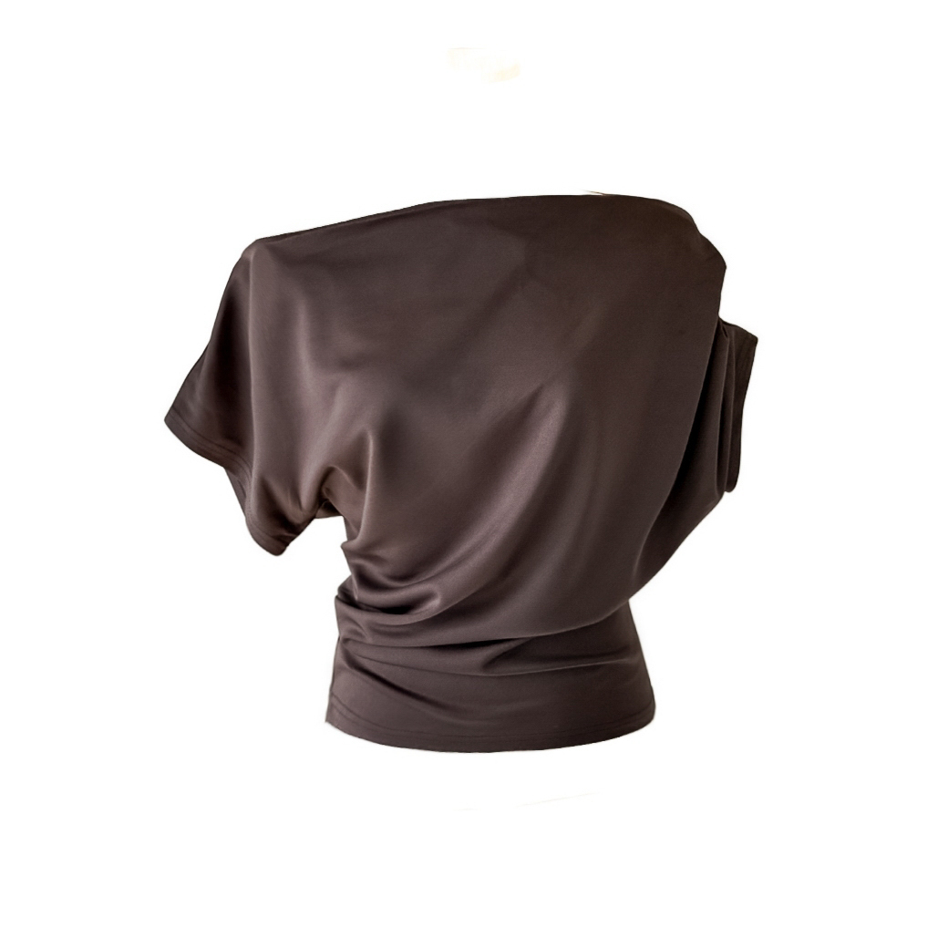 불균형한 어깨 절개 라인과 셔링 디테일이 감각적인 구조미를 완성하는 슬리브리스 탑입니다.
