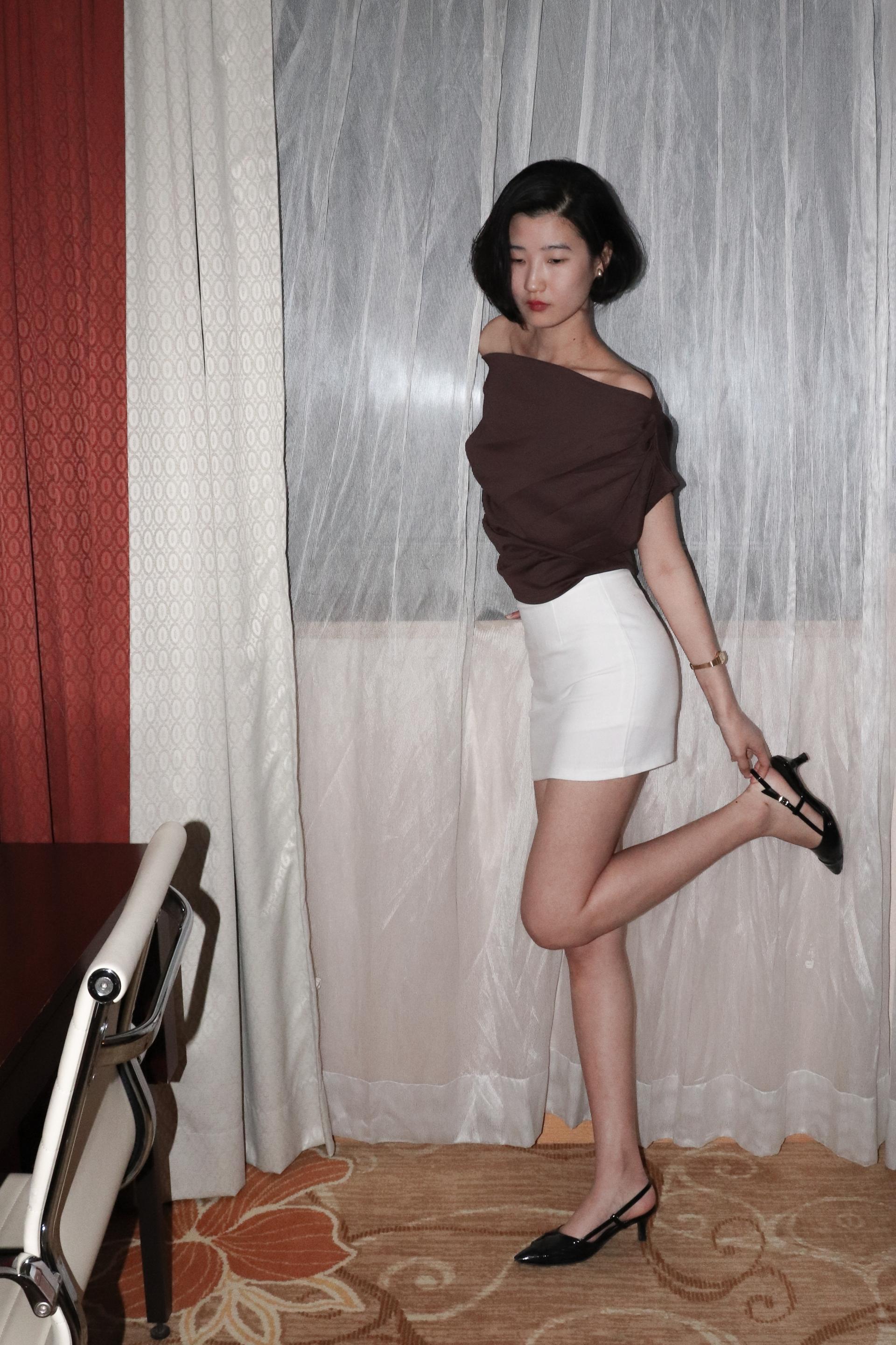 한쪽 어깨로 자연스럽게 흐르는 비대칭 실루엣이 시선을 끕니다.